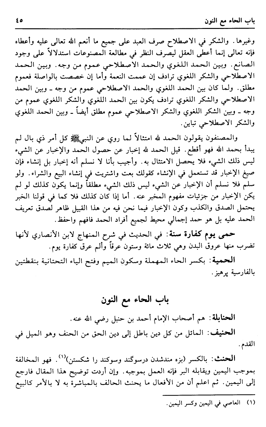 وَغَيرهَا. وَالشُّكْر فِي الِاصْطِلَاح صرف العَبْد على جَمِيع مَا أنعم الله تَعَالَى عَلَيْهِ وَأَعْطَاهُ فَإِنَّهُ تَعَالَى إِنَّمَا أعْطى الْعقل ليصرف النّظر فِي مطالعة المصنوعات اسْتِدْلَالا على وجود الصَّانِع. وَبَين الْحَمد اللّغَوِيّ وَالْحَمْد الاصطلاحي عُمُوم من وَجه. وَبَين الْحَمد الاصطلاحي وَالشُّكْر اللّغَوِيّ ترادف إِن عممت النِّعْمَة وَأما إِن خصصت بالواصلة فعموم مُطلق. وَلما كَانَ بَين الْحَمد اللّغَوِيّ وَالْحَمْد الاصطلاحي عُمُوم من وَجه - وَبَين الْحَمد الاصطلاحي وَالشُّكْر اللّغَوِيّ ترادف يكون بَين الْحَمد اللّغَوِيّ وَالشُّكْر اللّغَوِيّ عُمُوم من وَجه - وَبَين الشُّكْر اللّغَوِيّ وَالشُّكْر الاصطلاحي عُمُوم مُطلق أَيْضا - وَبَين الْحَمد اللّغَوِيّ وَالشُّكْر الاصطلاحي تبَاين.