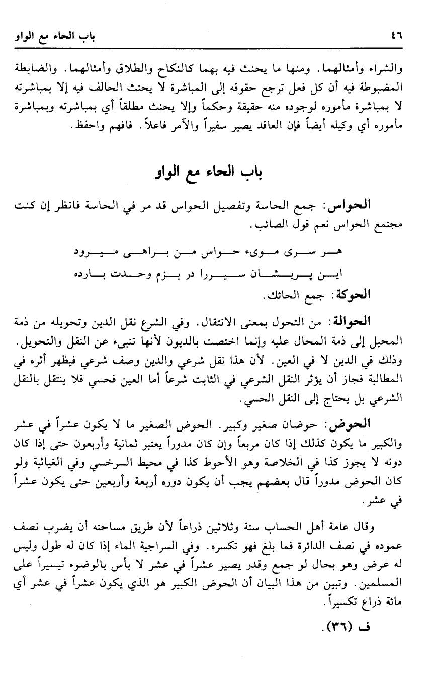 وَقَالَ عَامَّة أهل الْحساب سِتَّة وَثَلَاثِينَ ذِرَاعا لِأَن طَرِيق مساحته أَن يضْرب نصف عموده فِي نصف الدائرة فَمَا بلغ فَهُوَ تكسره. وَفِي السِّرَاجِيَّة المَاء إِذا كَانَ لَهُ طول وَلَيْسَ لَهُ عرض وَهُوَ بِحَال لَو جمع وَقدر يصير عشرا فِي عشر لَا بَأْس بِالْوضُوءِ تيسيرا على الْمُسلمين. وَتبين من هَذَا الْبَيَان أَن الْحَوْض الْكَبِير هُوَ الَّذِي يكون عشرا فِي عشر أَي مائَة ذِرَاع تكسيرا.