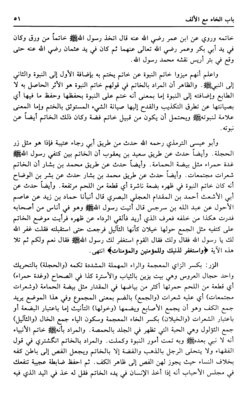الزر: بِكَسْر الزَّاي الْمُعْجَمَة وَالرَّاء الْمُهْملَة الْمُشَدّدَة تكمه (والحجلة) بِالتَّحْرِيكِ وَاحِد حجال الْعَرُوس وَهِي بَيت يزين بالثياب والأسترة كَذَا فِي الصِّحَاح (وغدة حَمْرَاء) أَي قِطْعَة من اللَّحْم حمرتها أَكثر من بياضها فِي الْمِقْدَار مثل بَيْضَة الْحَمَامَة (وشعرات مجتمعات) أَي عَلَيْهِ شَعرَات (وَالْجمع) بِالضَّمِّ بِمَعْنى الْمَجْمُوع وَفِي هَذَا الْموضع يُرِيد جمع الْكَفّ وَهُوَ أَن يجمع الْأَصَابِع ويضمها (وخولها) التَّأْنِيث إِمَّا بِاعْتِبَار الْبضْعَة أَو بِاعْتِبَار الشعرات (والخيلان) بِكَسْر الْخَاء الْمُعْجَمَة وَسُكُون الْيَاء جمع الْخَال (والثآليل) جمع الثؤلول وَهِي الْحبَّة الَّتِي تظهر فِي الْجلد بالحمصة. وَالْمرَاد بِأَنَّهُ - صَلَّى اللَّهُ عَلَيْهِ وَسَلَّم َ - خَاتم الْأَنْبِيَاء أَنه لَا نَبِي بعده - صَلَّى اللَّهُ عَلَيْهِ وَسَلَّم َ - وَبِه تمت أُمُور النُّبُوَّة وكملت. وَالْمرَاد بالخاتم انكشتري فِي قَول الْفُقَهَاء وَلَا يتحلى الرجل بِالذَّهَب وَالْفِضَّة إِلَّا بالخاتم وَيجْعَل الفص إِلَى بَاطِن كَفه بِخِلَاف النِّسَاء حَيْثُ يجوز لَهُنَّ الفص إِلَى ظَاهر الْكَفّ. ثمَّ احفظ ضابطة عَجِيبَة تنفعك فِي مجْلِس الأحباب أَنه إِذا أَخذ الْإِنْسَان فِي يَده الْخَاتم فَقل لَهُ خُذ فِي الْيَد الَّذِي فِيهِ