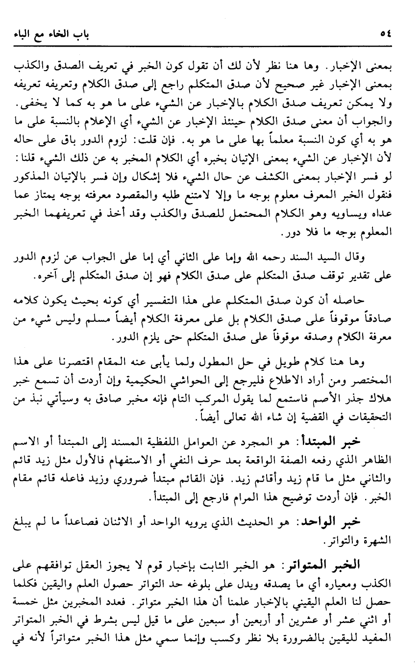 بِمَعْنى الْإِخْبَار. وَهَا هُنَا نظر لِأَن لَك أَن تَقول كَون الْخَبَر فِي تَعْرِيف الصدْق وَالْكذب بِمَعْنى الْإِخْبَار غير صَحِيح لِأَن صدق الْمُتَكَلّم رَاجع إِلَى صدق الْكَلَام وتعريفه تَعْرِيفه وَلَا يُمكن تَعْرِيف صدق الْكَلَام بالإخبار عَن الشَّيْء على مَا هُوَ بِهِ كَمَا لَا يخفى. وَالْجَوَاب أَن معنى صدق الْكَلَام حِينَئِذٍ الْإِخْبَار عَن الشَّيْء أَي الْإِعْلَام بِالنِّسْبَةِ على مَا هُوَ بِهِ أَي كَون النِّسْبَة معلما بهَا على مَا هُوَ بِهِ. فَإِن قلت: لُزُوم الدّور بَاقٍ على حَاله لِأَن الْإِخْبَار عَن الشَّيْء بِمَعْنى الْإِتْيَان بِخَبَرِهِ أَي الْكَلَام الْمخبر بِهِ عَن ذَلِك الشَّيْء قُلْنَا: لَو فسر الْإِخْبَار بِمَعْنى الْكَشْف عَن حَال الشَّيْء فَلَا إِشْكَال وَإِن فسر بالإتيان الْمَذْكُور فَنَقُول الْخَبَر الْمُعَرّف مَعْلُوم بِوَجْه مَا وَإِلَّا لامتنع طلبه وَالْمَقْصُود مَعْرفَته بِوَجْه يمتاز عَمَّا عداهُ ويساويه وَهُوَ الْكَلَام الْمُحْتَمل للصدق وَالْكذب وَقد أَخذ فِي تعريفهما الْخَبَر الْمَعْلُوم بِوَجْه مَا فَلَا دور.