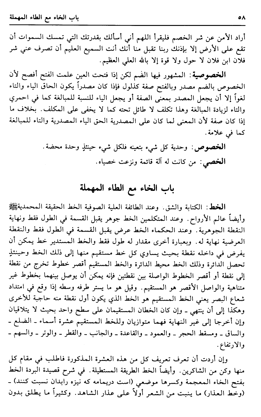 وَإِن أردْت أَن تعرف تَعْرِيف كل من هَذِه الْعشْرَة الْمَذْكُورَة فاطلب فِي مقَام كل مِنْهَا وَكن من الشَّاكِرِينَ. وَأَيْضًا الْخط الطَّرِيقَة المستطيلة. فِي شرح قصيدة الْبردَة الْخط بِفَتْح الْخَاء الْمُعْجَمَة وَكسرهَا موضعي (است دريمامه كه نيزه رابدان نسبت كنند) - (وَخط العذار) مَا ينْبت من الشّعْر أَولا على عذار الشَّاهِد. وَكَثِيرًا مَا يُطلق بِدُونِ