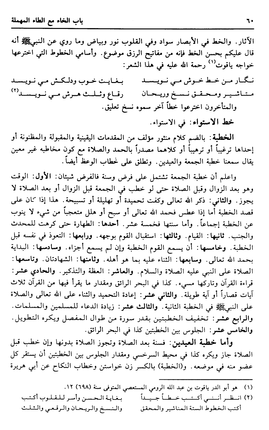 وَأما خطْبَة الْعِيدَيْنِ: فَسنة بعد الصَّلَاة وَتجوز الصَّلَاة بِدُونِهَا وَإِن خطب قبل الصَّلَاة جَازَ وَيكرهُ كَذَا فِي مُحِيط السَّرخسِيّ وَمِقْدَار الْجُلُوس بَين الْخطْبَتَيْنِ أَن يسْتَقرّ كل عُضْو مِنْهُ فِي مَوْضِعه. و (الْخطْبَة) بِالْكَسْرِ زن خواستن وخطاب النِّكَاح عَن أبي هُرَيْرَة