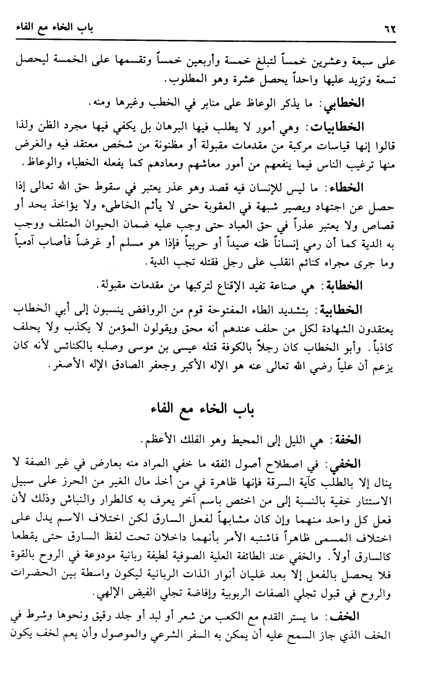 الخطاء: مَا لَيْسَ للْإنْسَان فِيهِ قصد وَهُوَ عذر يعْتَبر فِي سُقُوط حق الله تَعَالَى إِذا حصل عَن اجْتِهَاد وَيصير شُبْهَة فِي الْعقُوبَة حَتَّى لَا يَأْثَم الخاطئ وَلَا يُؤَاخذ بِحَدّ أَو قصاص وَلَا يعْتَبر عذرا فِي حق الْعباد حَتَّى وَجب عَلَيْهِ ضَمَان الْحَيَوَان الْمُتْلف وَوَجَب بِهِ الدِّيَة كَمَا أَن رمي إنْسَانا ظَنّه صيدا أَو حَرْبِيّا فَإِذا هُوَ مُسلم أَو غَرضا فَأصَاب آدَمِيًّا وَمَا جرى مجْرَاه كنائم انْقَلب على رجل فَقتله تجب الدِّيَة.