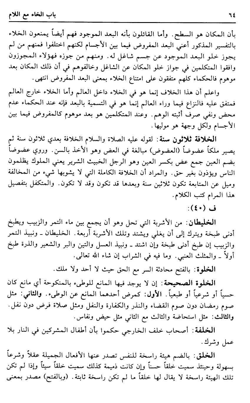 بِأَن الْمَكَان هُوَ السَّطْح. وَأما الْقَائِلُونَ بِأَنَّهُ الْبعد الْمَوْجُود فهم أَيْضا يمْنَعُونَ الْخَلَاء بالتفسير الْمَذْكُور أَعنِي الْبعد الْمَفْرُوض فِيمَا بَين الْأَجْسَام لكِنهمْ اخْتلفُوا فَمنهمْ من لم يجوز خلو الْبعد الْمَوْجُود عَن جسم شاغل لَهُ. وَمِنْهُم من جوزه فَهَؤُلَاءِ المجوزون وافقوا الْمُتَكَلِّمين فِي جَوَاز خلو الْمَكَان عَن الشاغل وخالفوهم فِي أَن ذَلِك الْمَكَان بعد موهوم فالحكماء كلهم متفقون على امْتنَاع الْخَلَاء بِمَعْنى الْبعد الْمَفْرُوض انْتهى.