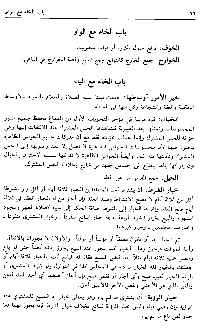 خِيَار الشَّرْط: أَن يشْتَرط أحد الْمُتَعَاقدين الْخِيَار ثَلَاثَة أَيَّام أَو أقل وَلَو اشْترطَا أَكثر من ثَلَاثَة أَيَّام لَا يَصح الِاشْتِرَاط وَفَسَد العقد فَإِن أجَاز من لَهُ الْخِيَار العقد فِي ثَلَاثَة أَيَّام صَحَّ العقد وَإِضَافَة الْخِيَار إِلَى الشَّرْط إِضَافَة الحكم إِلَى سَببه كَصَلَاة الظّهْر وَسُجُود السَّهْو، وَالْبيع بِخِيَار الشَّرْط أَرْبَعَة أوجه خِيَار البَائِع مُنْفَردا - وَخيَار المُشْتَرِي مُنْفَردا - وخيارهما مُجْتَمعين - وَخيَار غَيرهمَا.
