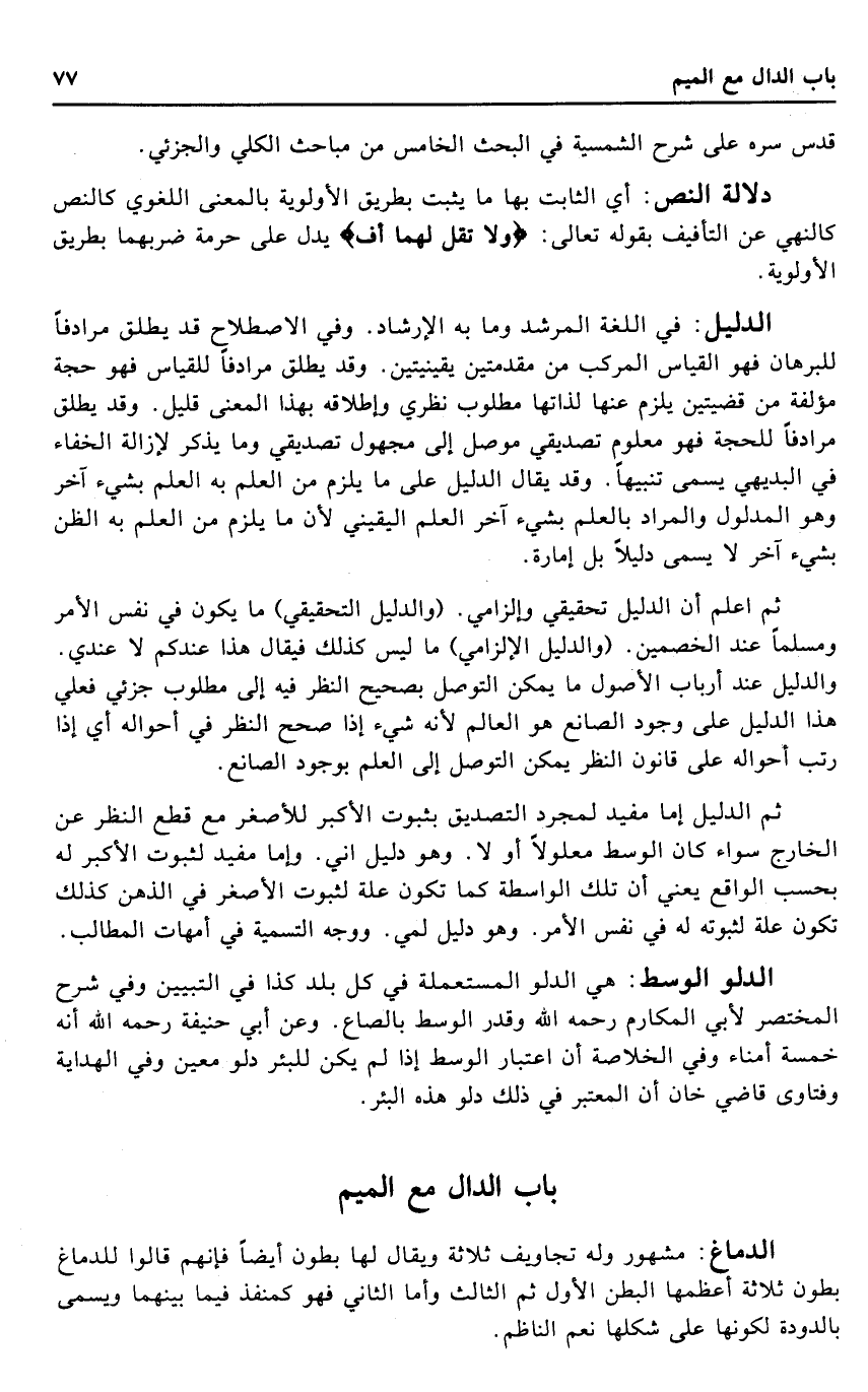 ثمَّ اعْلَم أَن الدَّلِيل تحقيقي وإلزامي. (وَالدَّلِيل التحقيقي) مَا يكون فِي نفس الْأَمر وَمُسلمًا عِنْد الْخَصْمَيْنِ. (وَالدَّلِيل الإلزامي) مَا لَيْسَ كَذَلِك فَيُقَال هَذَا عنْدكُمْ لَا عِنْدِي. وَالدَّلِيل عِنْد أَرْبَاب الْأُصُول مَا يُمكن التَّوَصُّل بِصَحِيح النّظر فِيهِ إِلَى مَطْلُوب جزئي فعلي هَذَا الدَّلِيل على وجود الصَّانِع هُوَ الْعَالم لِأَنَّهُ شَيْء إِذا صحّح النّظر فِي أَحْوَاله أَي إِذا رتب أَحْوَاله على قانون النّظر يُمكن التَّوَصُّل إِلَى الْعلم بِوُجُود الصَّانِع.