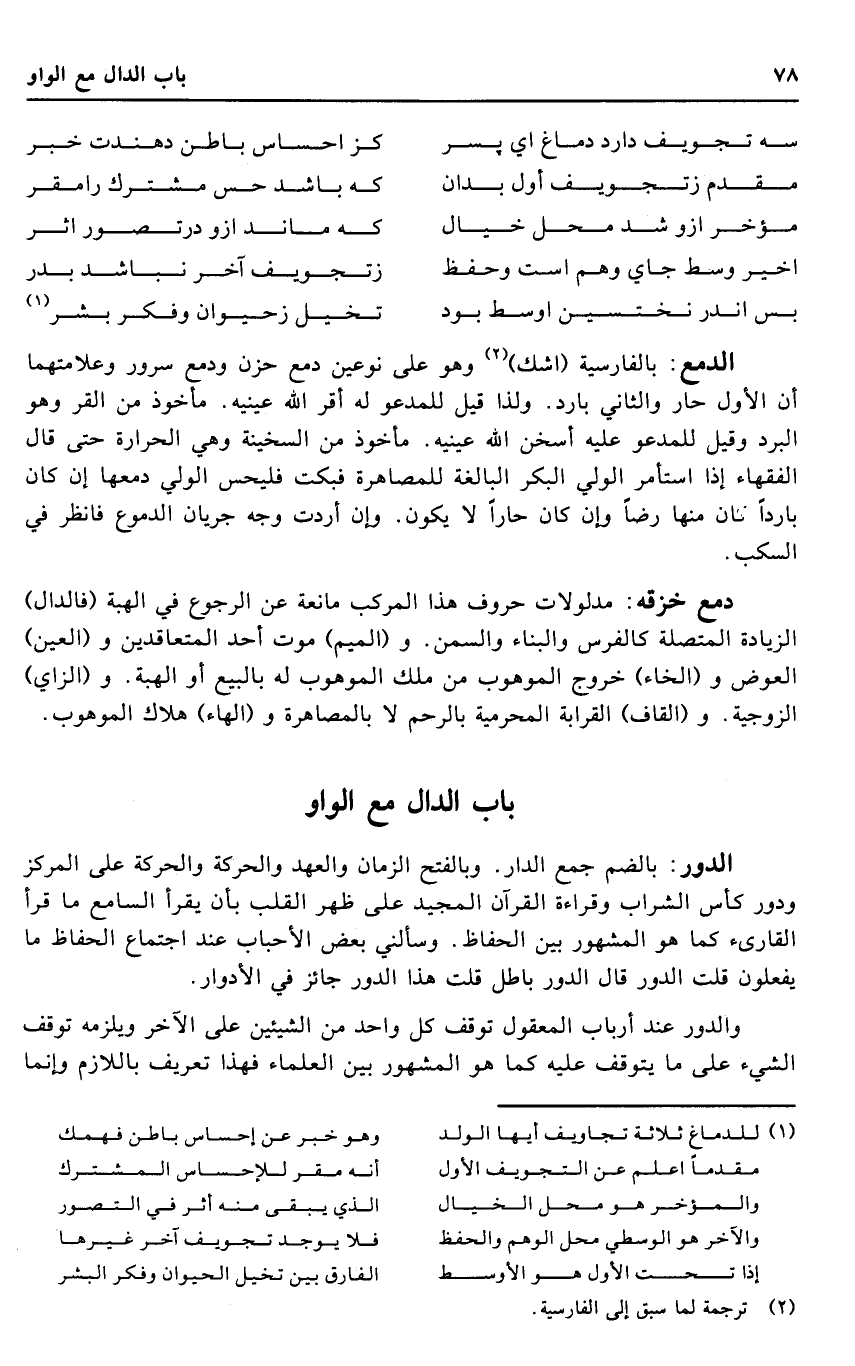 الدمع: بِالْفَارِسِيَّةِ (اشك) وَهُوَ على نَوْعَيْنِ دمع حزن ودمع سرُور وعلامتهما أَن الأول حَار وَالثَّانِي بَارِد. وَلذَا قيل للمدعو لَهُ أقرّ الله عَيْنَيْهِ. مَأْخُوذ من القر وَهُوَ الْبرد وَقيل للمدعو عَلَيْهِ أسخن الله عَيْنَيْهِ. مَأْخُوذ من السخينة وَهِي الْحَرَارَة حَتَّى قَالَ الْفُقَهَاء إِذا استأمر الْوَلِيّ الْبكر الْبَالِغَة للمصاهرة فَبَكَتْ فليحس الْوَلِيّ دمعها إِن كَانَ بَارِدًا كَانَ مِنْهَا رضَا وَإِن كَانَ حارا لَا يكون. وَإِن أردْت وَجه جَرَيَان الدُّمُوع فَانْظُر فِي السكب.