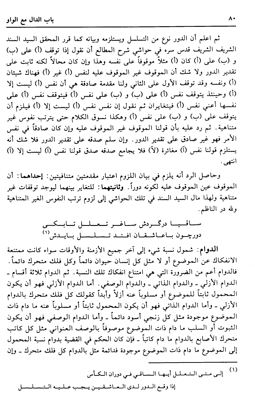 ثمَّ اعْلَم أَن الدّور نوع من التسلسل ويستلزمه وَبَيَانه كَمَا قرر الْمُحَقق السَّيِّد السَّنَد الشريف الشريف قدس سره فِي حَوَاشِي شرح الْمطَالع أَن نقُول إِذا توقف (أ) على (ب) و (ب) على (أ) كَانَ (أ) مثلا مَوْقُوفا على نَفسه وَهَذَا وَإِن كَانَ محالا لكنه ثَابت على تَقْدِير الدّور وَلَا شكّ أَن الْمَوْقُوف غير الْمَوْقُوف عَلَيْهِ لنَفس (أ) غير (أ) فهناك شَيْئَانِ (أ) وَنَفسه وَقد توقف الأول على الثَّانِي وَلنَا مُقَدّمَة صَادِقَة هِيَ أَن نفس (أ) لَيست إِلَّا (أ) وَحِينَئِذٍ يتَوَقَّف نفس (أ) على (ب) و (ب) على نفس (أ) فَيتَوَقَّف نفس (أ) على نَفسهَا أَعنِي نفس (أ) فيتغايران ثمَّ نقُول إِن نفس نفس (أ) لَيست إِلَّا (أ) فَيلْزم أَن يتَوَقَّف على (ب) و (ب) على نفس (أ) وَهَكَذَا نسوق الْكَلَام حَتَّى يَتَرَتَّب نفوس غير متناهية. ثمَّ رد عَلَيْهِ بِأَن قَوْلنَا الْمَوْقُوف غير الْمَوْقُوف عَلَيْهِ وَإِن كَانَ صَادِقا فِي نفس الْأَمر فَهُوَ غير صَادِق على تَقْدِير الدّور. وَإِن سلم صدقه على تَقْدِير الدّور فَلَا شكّ أَنه يسْتَلْزم قَوْلنَا نفس (آ) مغائرة (لآ) فَلَا يُجَامع صدقه صدق قَوْلنَا نفس (آ) لَيست إِلَّا (آ) انْتهى.