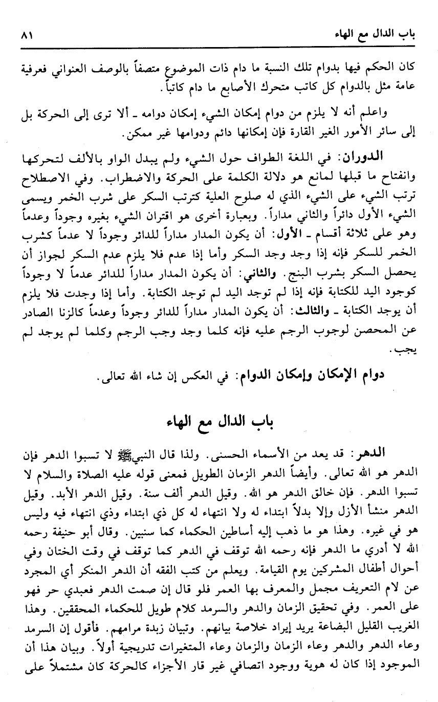 الدَّهْر: قد يعد من الْأَسْمَاء الْحسنى. وَلذَا قَالَ النَّبِي - صَلَّى اللَّهُ عَلَيْهِ وَسَلَّم َ - لَا تسبوا الدَّهْر فَإِن الدَّهْر هُوَ الله تَعَالَى. وَأَيْضًا الدَّهْر الزَّمَان الطَّوِيل فَمَعْنَى قَوْله عَلَيْهِ الصَّلَاة وَالسَّلَام لَا تسبوا الدَّهْر. فَإِن خَالق الدَّهْر هُوَ الله. وَقيل الدَّهْر ألف سنة. وَقيل الدَّهْر الْأَبَد. وَقيل الدَّهْر منشأ الْأَزَل وَإِلَّا بَدَلا ابْتِدَاء لَهُ وَلَا انْتِهَاء لَهُ كل ذِي ابْتِدَاء وَذي انْتِهَاء فِيهِ وَلَيْسَ هُوَ فِي غَيره. وَهَذَا هُوَ مَا ذهب إِلَيْهِ أساطين الْحُكَمَاء كَمَا سنبين. وَقَالَ أَبُو حنيفَة رَحمَه الله لَا أَدْرِي مَا الدَّهْر فَإِنَّهُ رَحمَه الله توقف فِي الدَّهْر كَمَا توقف فِي وَقت الْخِتَان وَفِي أَحْوَال أَطْفَال الْمُشْركين يَوْم الْقِيَامَة. وَيعلم من كتب الْفِقْه أَن الدَّهْر الْمُنكر أَي الْمُجَرّد عَن لَام التَّعْرِيف مُجمل والمعرف بهَا الْعُمر فَلَو قَالَ إِن صمت الدَّهْر فَعَبْدي حر فَهُوَ على الْعُمر. وَفِي تَحْقِيق الزَّمَان والدهر والسرمد كَلَام طَوِيل للحكماء الْمُحَقِّقين. وَهَذَا الْغَرِيب الْقَلِيل البضاعة يُرِيد إِيرَاد خُلَاصَة بيانهم. وتبيان زبدة مرامهم. فَأَقُول إِن السرمد وعَاء الدَّهْر والدهر وعَاء الزَّمَان وَالزَّمَان وعَاء المتغيرات تدريجية أَولا. وَبَيَان هَذَا أَن الْمَوْجُود إِذا كَانَ لَهُ هوية وَوُجُود اتصافي غير قار الْأَجْزَاء كالحركة كَانَ مُشْتَمِلًا على