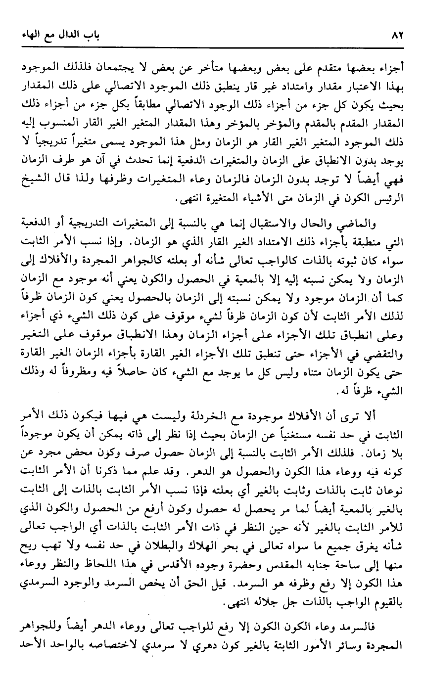 أَلا ترى أَن الأفلاك مَوْجُودَة مَعَ الخردلة وَلَيْسَت هِيَ فِيهَا فَيكون ذَلِك الْأَمر الثَّابِت فِي حد نَفسه مستغنيا عَن الزَّمَان بِحَيْثُ إِذا نظر إِلَى ذَاته يُمكن أَن يكون مَوْجُودا بِلَا زمَان. فَلذَلِك الْأَمر الثَّابِت بِالنِّسْبَةِ إِلَى الزَّمَان حُصُول صرف وَكَون مَحْض مُجَرّد عَن كَونه فِيهِ ووعاء هَذَا الْكَوْن والحصول هُوَ الدَّهْر. وَقد علم مِمَّا ذكرنَا أَن الْأَمر الثَّابِت نَوْعَانِ ثَابت بِالذَّاتِ وثابت بِالْغَيْر أَي بعلته فَإِذا نسب الْأَمر الثَّابِت بِالذَّاتِ إِلَى الثَّابِت بِالْغَيْر بالمعية أَيْضا لما مر يحصل لَهُ حُصُول وَكَون أرفع من الْحُصُول والكون الَّذِي لِلْأَمْرِ الثَّابِت بِالْغَيْر لِأَنَّهُ حِين النّظر فِي ذَات الْأَمر الثَّابِت بِالذَّاتِ أَي الْوَاجِب تَعَالَى شَأْنه يغرق جَمِيع مَا سواهُ تَعَالَى فِي بَحر الْهَلَاك والبطلان فِي حد نَفسه وَلَا تهب ريح مِنْهَا إِلَى ساحة جنابه الْمُقَدّس وحضرة وجوده الأقدس فِي هَذَا اللحاظ وَالنَّظَر ووعاء هَذَا الْكَوْن إِلَّا رفع وظرفه هُوَ السرمد. قيل الْحق أَن يخص السرمد والوجود السرمدي بالقيوم الْوَاجِب بِالذَّاتِ جلّ جَلَاله انْتهى.