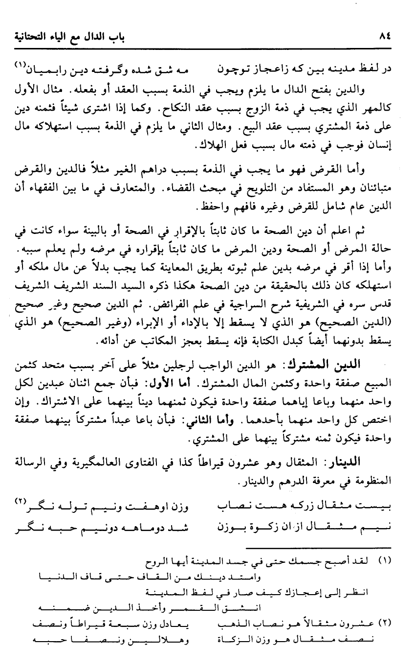 وَالدّين بِفَتْح الدَّال مَا يلْزم وَيجب فِي الذِّمَّة بِسَبَب العقد أَو بِفِعْلِهِ. مِثَال الأول كالمهر الَّذِي يجب فِي ذمَّة الزَّوْج بِسَبَب عقد النِّكَاح. وكما إِذا اشْترى شَيْئا فثمنه دين على ذمَّة المُشْتَرِي بِسَبَب عقد البيع. وَمِثَال الثَّانِي مَا يلْزم فِي الذِّمَّة بِسَبَب استهلاكه مَال إِنْسَان فَوَجَبَ فِي ذمَّته مَال بِسَبَب فعل الْهَلَاك.