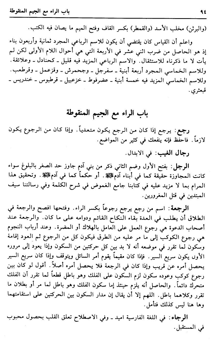 الرجل: بِفَتْح الأول وَضم الثَّانِي ذكر من بني آدم جَاوز حد الصغر بِالْبُلُوغِ سَوَاء كَانَت الْمُجَاوزَة حَقِيقَة كَمَا فِي أَبنَاء آدم عَلَيْهِ السَّلَام. أَو حكما كَمَا فِي آدم عَلَيْهِ السَّلَام. وَتَحْقِيق هَذَا المرام بِمَا لَا مزِيد عَلَيْهِ فِي كتَابنَا جَامع الغموض فِي شرح الْكَلِمَة وَفِي رسالتنا سيف المبتدين فِي قتل المغرورين.