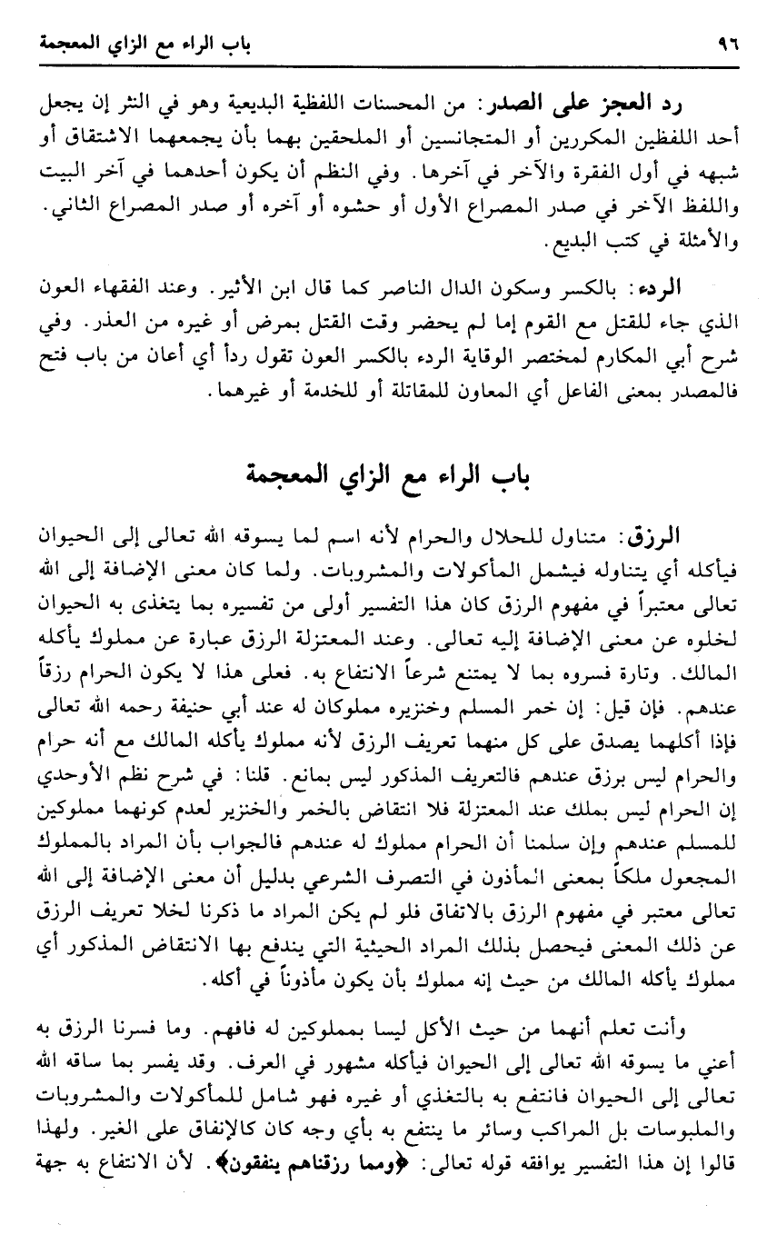 الرزق: متناول للْحَلَال وَالْحرَام لِأَنَّهُ اسْم لما يَسُوقهُ الله تَعَالَى إِلَى الْحَيَوَان فيأكله أَي يتَنَاوَلهُ فَيشْمَل المأكولات والمشروبات. وَلما كَانَ معنى الْإِضَافَة إِلَى الله تَعَالَى مُعْتَبرا فِي مَفْهُوم الرزق كَانَ هَذَا التَّفْسِير أولى من تَفْسِيره بِمَا يتغذى بِهِ الْحَيَوَان لخلوه عَن معنى الْإِضَافَة إِلَيْهِ تَعَالَى. وَعند الْمُعْتَزلَة الرزق عبارَة عَن مَمْلُوك يَأْكُلهُ الْمَالِك. وَتارَة فسروه بِمَا لَا يمْتَنع شرعا الِانْتِفَاع بِهِ. فعلى هَذَا لَا يكون الْحَرَام رزقا عِنْدهم. فَإِن قيل: إِن خمر الْمُسلم وخنزيره مملوكان لَهُ عِنْد أبي حنيفَة رَحمَه الله تَعَالَى فَإِذا أكلهما يصدق على كل مِنْهُمَا تَعْرِيف الرزق لِأَنَّهُ مَمْلُوك يَأْكُلهُ الْمَالِك مَعَ أَنه حرَام وَالْحرَام لَيْسَ برزق عِنْدهم فالتعريف الْمَذْكُور لَيْسَ بمانع. قُلْنَا: فِي شرح نظم الأوحدي إِن الْحَرَام لَيْسَ بِملك عِنْد الْمُعْتَزلَة فَلَا انْتِقَاض بِالْخمرِ وَالْخِنْزِير لعدم كَونهمَا مملوكين للْمُسلمِ عِنْدهم وَإِن سلمنَا أَن الْحَرَام مَمْلُوك لَهُ عِنْدهم فَالْجَوَاب بِأَن المُرَاد بالمملوك المجعول ملكا بِمَعْنى الْمَأْذُون فِي التَّصَرُّف الشَّرْعِيّ بِدَلِيل أَن معنى الْإِضَافَة إِلَى الله تَعَالَى مُعْتَبر فِي مَفْهُوم الرزق بالِاتِّفَاقِ فَلَو لم يكن المُرَاد مَا ذكرنَا لخلا تَعْرِيف الرزق عَن ذَلِك الْمَعْنى فَيحصل بذلك المُرَاد الْحَيْثِيَّة الَّتِي ينْدَفع بهَا الانتقاض الْمَذْكُور أَي مَمْلُوك يَأْكُلهُ الْمَالِك من حَيْثُ إِنَّه مَمْلُوك بِأَن يكون مَأْذُونا فِي أكله.