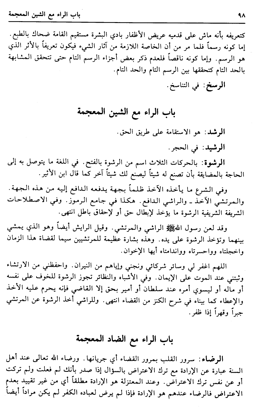 وَقد لعن رَسُول الله - صَلَّى اللَّهُ عَلَيْهِ وَسَلَّم َ - الراشي والمرتشي. وَقيل الرايش أَيْضا وَهُوَ الَّذِي يمشي بَينهمَا وَتُؤْخَذ الرِّشْوَة على يَده. وَهَذِه بِشَارَة عَظِيمَة للمرتشيين سِيمَا لقضاة هَذَا الزَّمَان واخجلتاه وواحسرتاه وواندامتاه أَيهَا الإخوان.