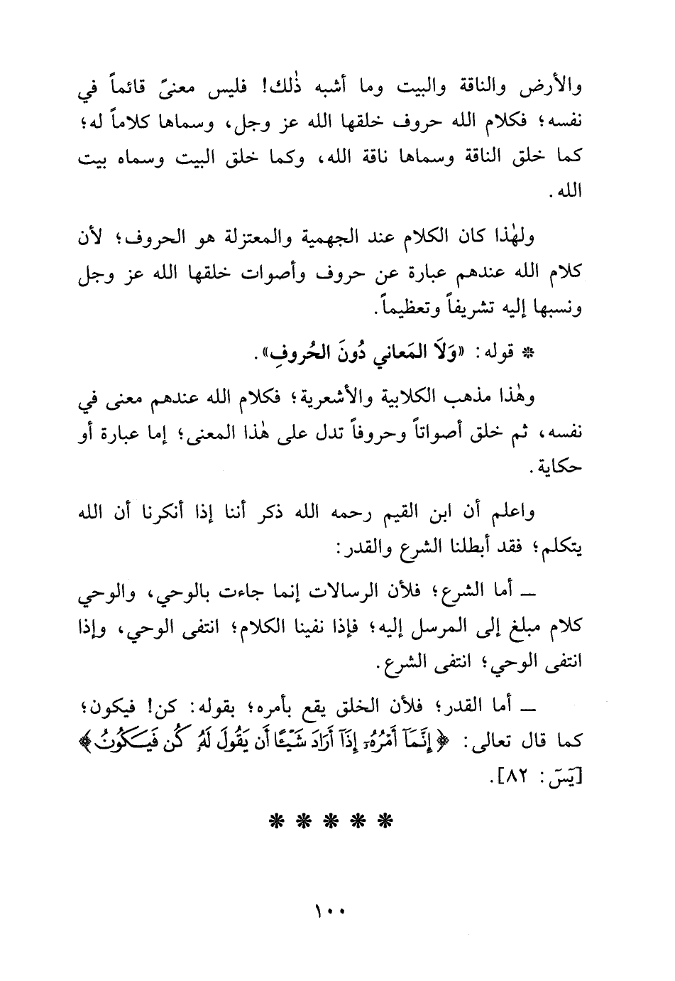 والأرض والناقة والبيت وما أشبه ذلك! فليس معنىً قائمًا في نفسه، فكلام الله حروف خلقها الله عزَّ وجلَّ، وسماها كلامًا له، كما خلق الناقة وسماها ناقة الله، وكما خلق البيت وسماه بيت الله.