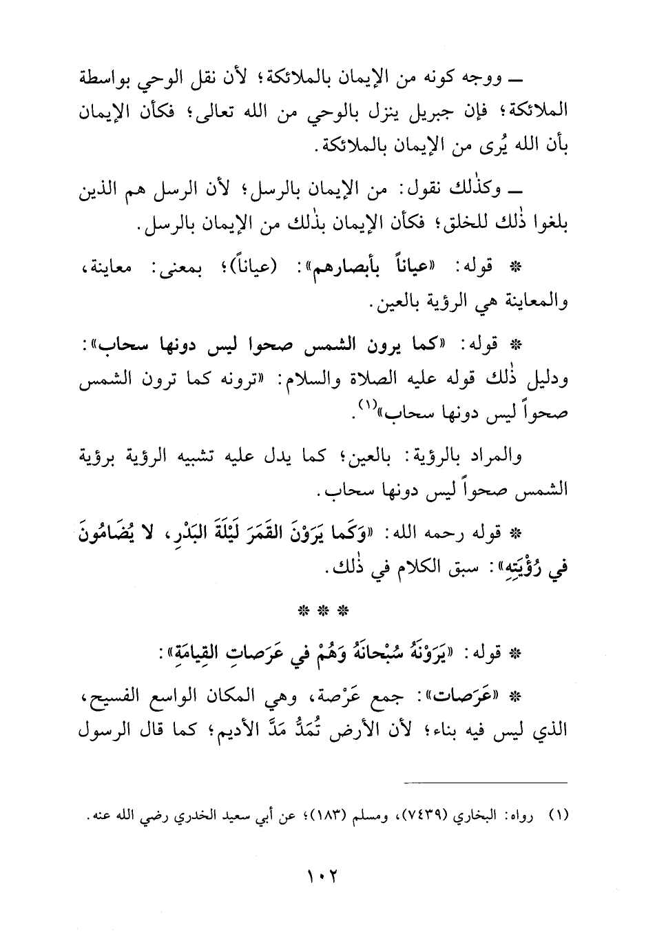 * قوله: "كما يرون الشمس صحوا ليس دونها سحاب": ودليل ذلك قوله عليه الصلاة والسلام: "ترونه كما ترون الشمس صحوًا ليس دونها سحاب" (¬1).