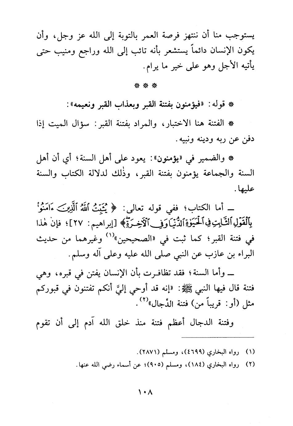 - أما الكتاب؛ ففي قوله تعالى: {يُثَبِّتُ اللَّهُ الَّذِينَ آمَنُوا بِالْقَوْلِ الثَّابِتِ فِي الْحَيَاةِ الدُّنْيَا وَفِي الْآخِرَةِ} [إبراهيم: 27]؛ فإن هذا في فتنة القبر؛ كما ثبت في "الصحيحين" (¬1) وغيرهما من حديث البراء بن عازب عن النبي صلى الله عليه وعلى آله وسلم.