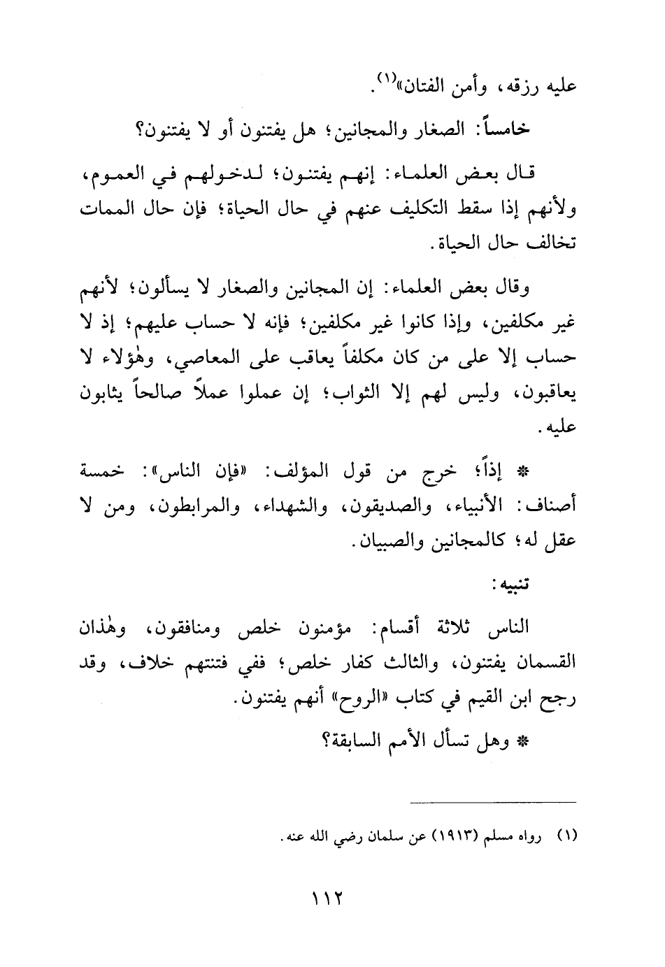 الناس ثلاثة أقسام: مؤمنون خلص ومنافقون، وهذان القسمان يفتنون، والثالث كفار خلص، ففي فتنتهم خلاف، وقد رجح ابن القيم في كتاب "الروح" أنهم يفتنون.