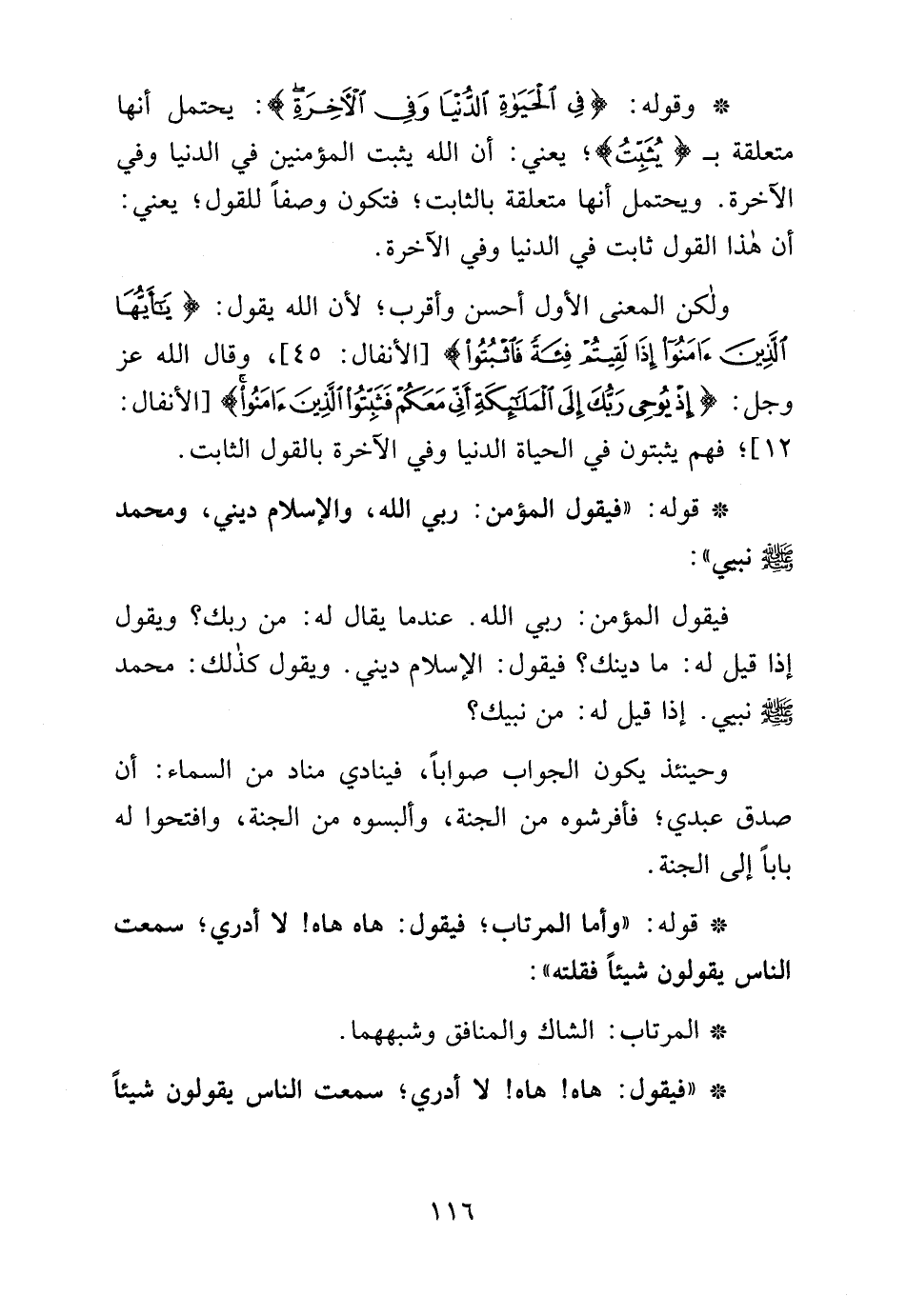 فيقول المؤمن: ربي الله. عندما يقال له: من ربك؟ ويقول إذا قيل له: ما دينك؟ فيقول: الإِسلام ديني. ويقول كذلك: محمَّد - صلى الله عليه وسلم - نبيي. إذا قيل له: من نبيك؟