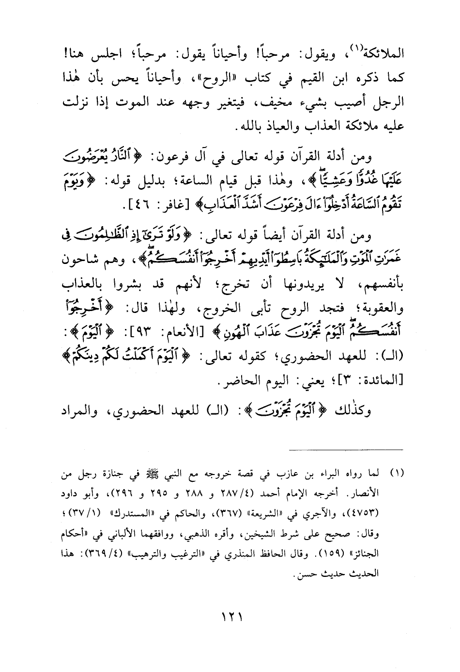 ومن أدلة القرآن أيضًا قوله تعالى: {وَلَوْ تَرَى إِذِ الظَّالِمُونَ فِي غَمَرَاتِ الْمَوْتِ وَالْمَلَائِكَةُ بَاسِطُو أَيْدِيهِمْ أَخْرِجُوا أَنْفُسَكُمُ}، وهم شاحون بأنفسهم، لا يريدونها أن تخرج؛ لأنهم قد بشروا بالعذاب والعقوبة؛ فتجد الروح تأبى الخروج، ولهذا قال: {أَخْرِجُوا أَنْفُسَكُمُ الْيَوْمَ تُجْزَوْنَ عَذَابَ الْهُونِ} [الأنعام: 93]: {الْيَوْمَ}: (الـ): للعهد الحضوري؛ كقوله تعالى: {الْيَوْمَ أَكْمَلْتُ لَكُمْ دِينَكُمْ} [المائدة: 3]؛ يعني: اليوم الحاضر.