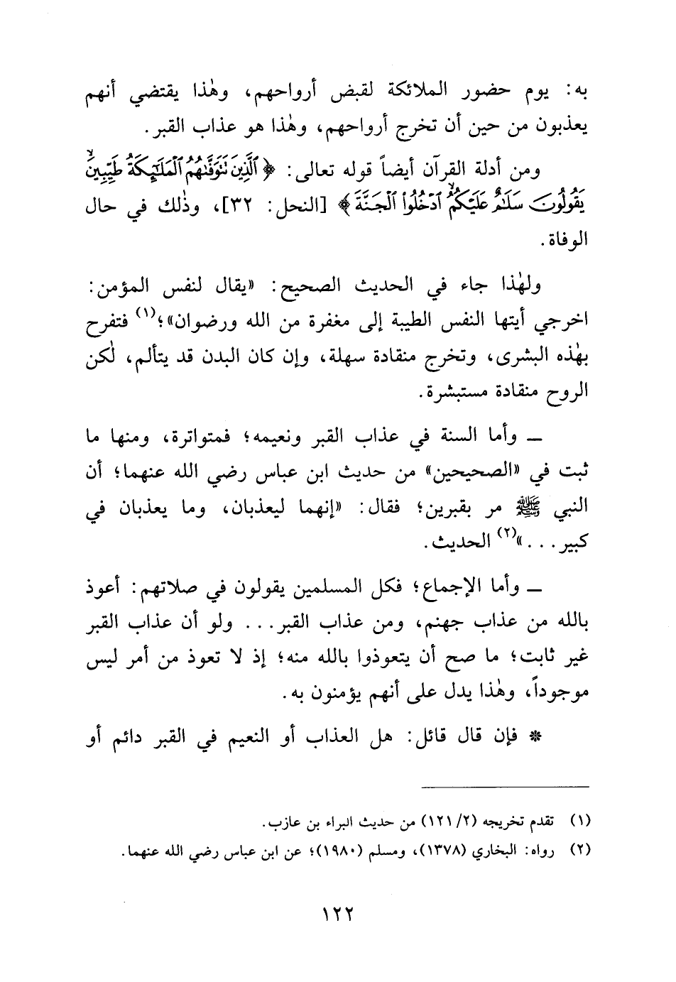 - وأما الإجماع؛ فكل المسلمين يقولون في صلاتهم: أعوذ بالله من عذاب جهنم، ومن عذاب القبر ... ولو أن عذاب القبر غير ثابت، ما صح أن يتعوذوا بالله منه، إذ لا تعوذ من أمر ليس موجودًا، وهذا يدل على أنهم يؤمنون به.