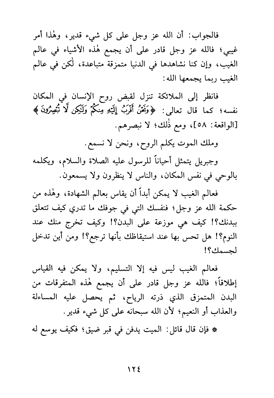 فعالم الغيب ليس فيه إلا التسليم، ولا يمكن فيه القياس إطلاقًا؛ فالله عَزَّ وَجَلَّ قادر على أن يجمع هذه المتفرقات من البدن المتمزق الذي ذرته الرياح، ثم يحصل عليه المساءلة والعذاب أو النعيم؛ لأن الله سبحانه على كل شيء قدير.
