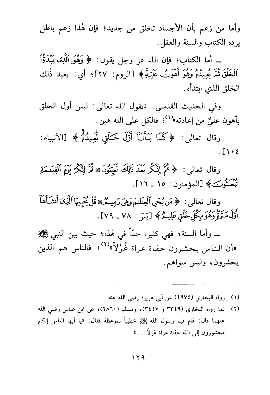 (¬2) لما رواه البخاري (3349 و 3447)، ومسلم (2860)؛ عن ابن عباس رضي الله عنهما قال: قام فينا رسول الله - صلى الله عليه وسلم - خطيبًا بموعظة فقال: "يا أيها الناس إنكم محشورون إلى الله حفاة عراة غرلًا ... ".