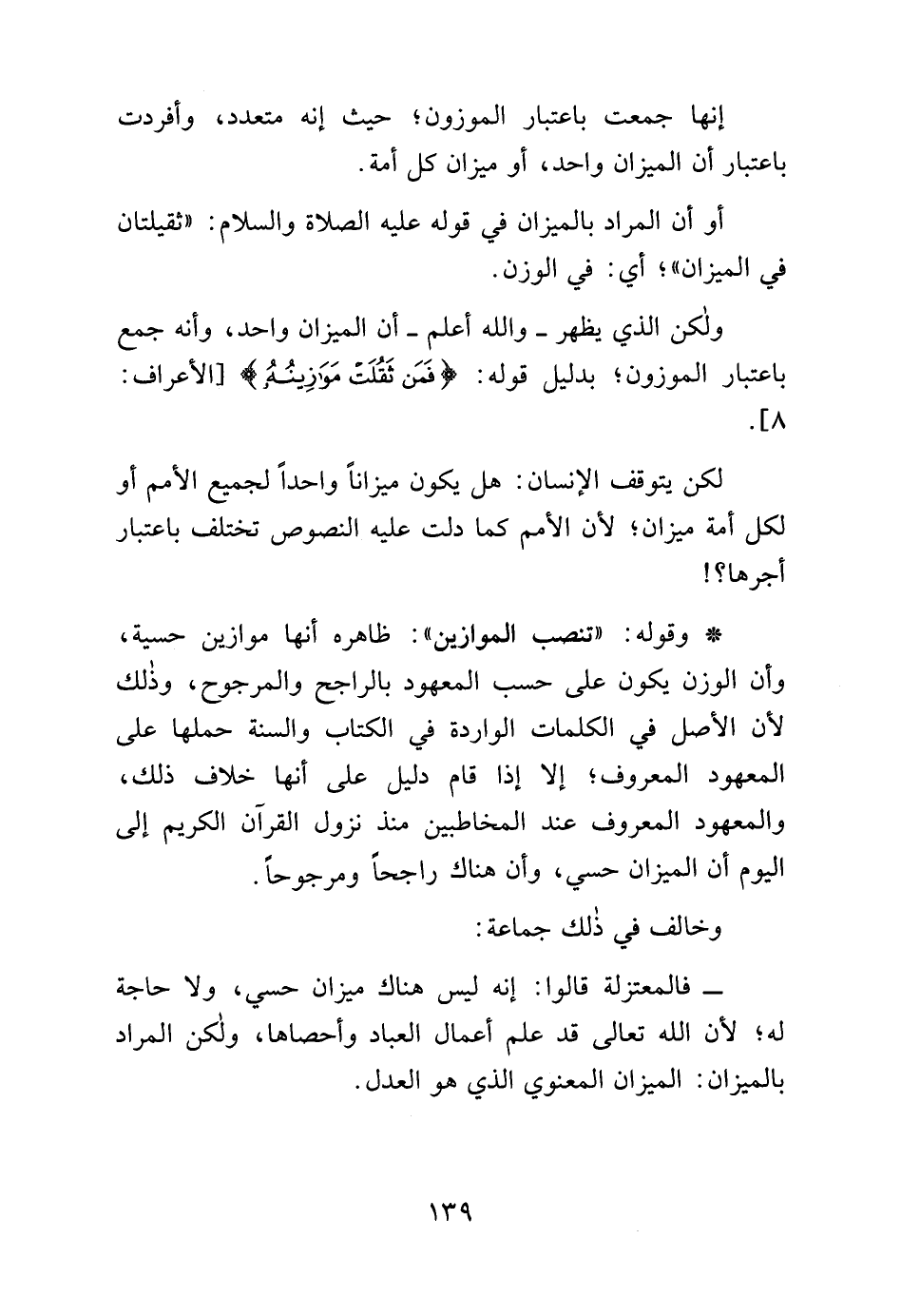 - فالمعتزلة قالوا: إنه ليس هناك ميزان حسي، ولا حاجة له؛ لأن الله تعالى قد علم أعمال العباد وأحصاها, ولكن المراد بالميزان: الميزان المعنوي الذي هو العدل.