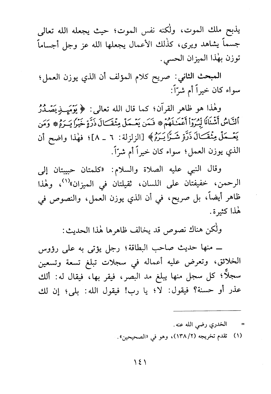 المبحث الثاني: صريح كلام المؤلف أن الذي يوزن العمل، سواء كان خيرًا أم شرًّا: