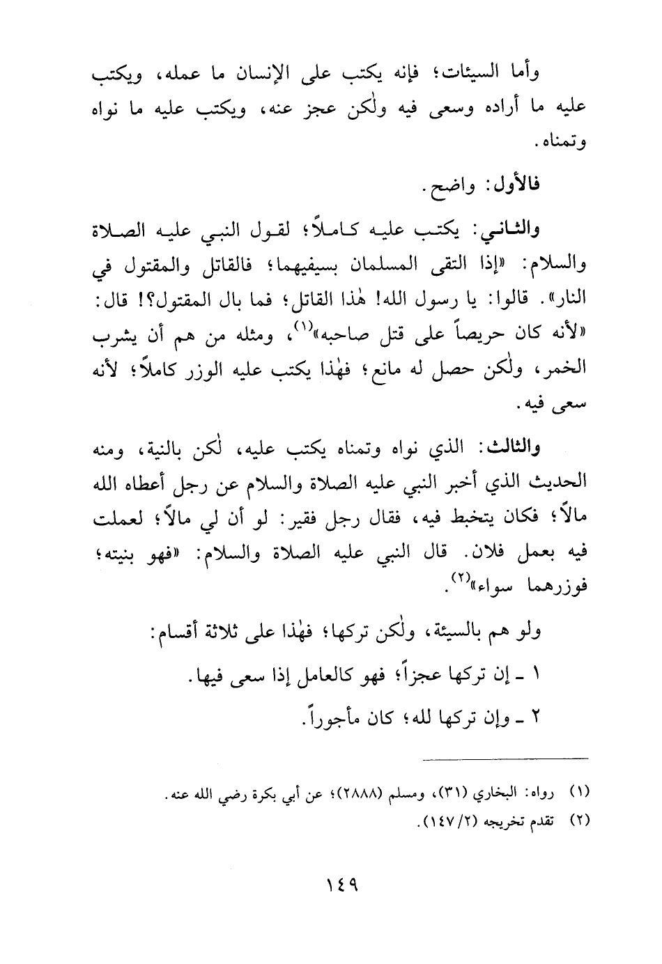 والثالث: الذي نواه وتمناه يكتب عليه، لكن بالنية، ومنه الحديث الذي أخبر النبي عليه الصلاة والسلام عن رجل أعطاه الله مالًا؛ فكان يتخبط فيه، فقال رجل فقير: لو أن لي مالًا؛ لعملت فيه بعمل فلان. قال النبي عليه الصلاة والسلام: "فهو بنيته؛ فوزرهما سواء" (¬2).