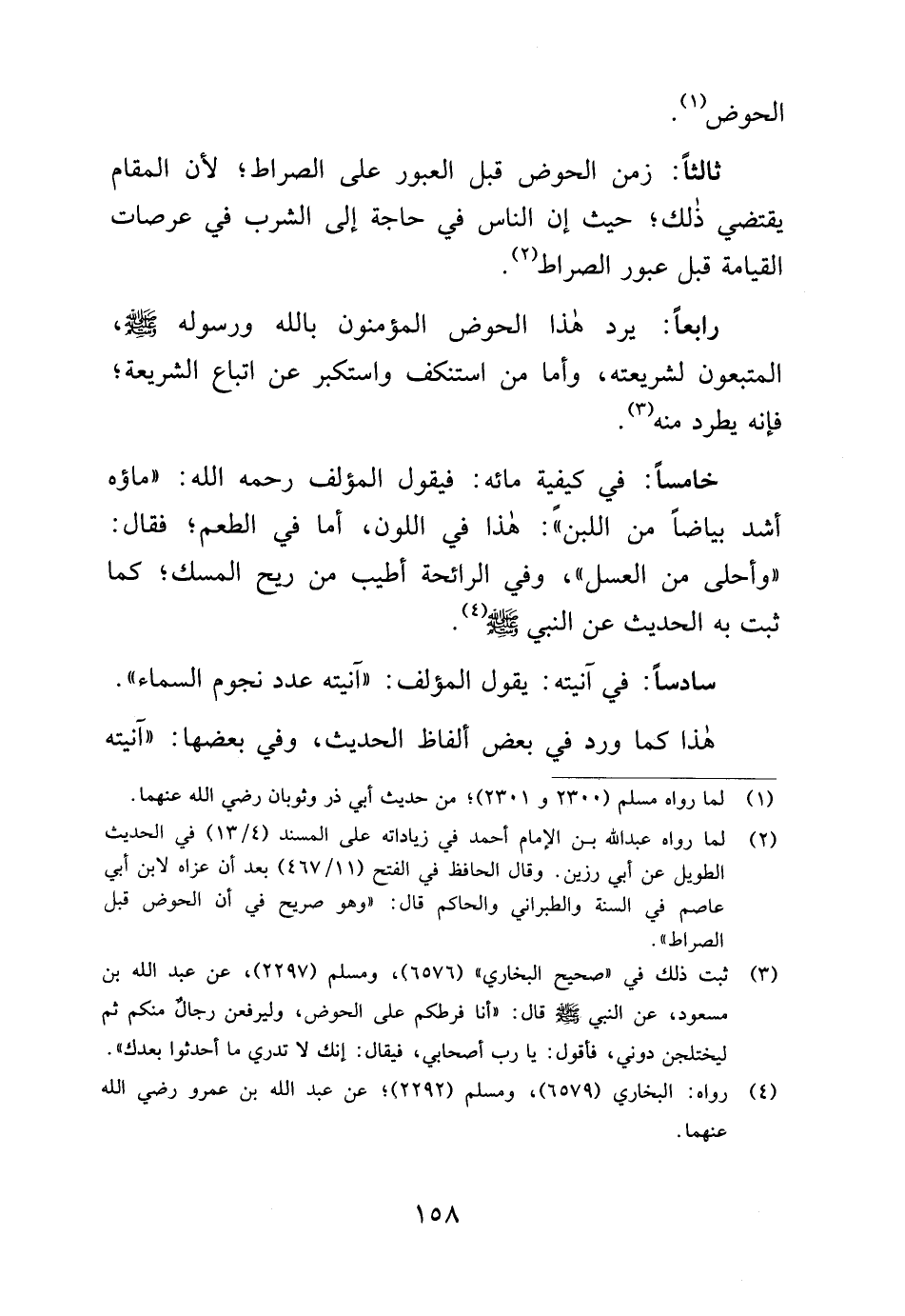 (¬2) لما رواه عبد الله بن الإمام أحمد في زياداته على المسند (4/ 13) في الحديث الطويل عن أبي رزين. وقال الحافظ في الفتح (11/ 467) بعد أن عزاه لابن أبي عاصم في السنة والطبراني والحاكم قال: "وهو صريح في أن الحوض قبل الصراط".