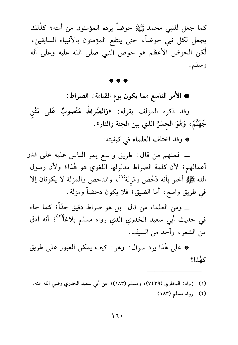 - ومن العلماء من قال: بل هو صراط دقيق جدًّا؛ كما جاء في حديث أبي سعيد الخدري الذي رواه مسلم بلاغًا (¬2)؛ أنه أدق من الشعر، وأحد من السيف.
