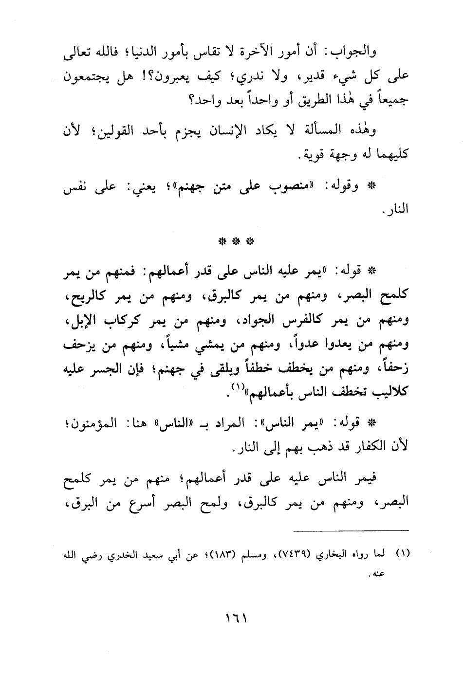 * قوله: "يمر عليه الناس على قدر أعمالهم: فمنهم من يمر كلمح البصر، ومنهم من يمر كالبرق، ومنهم من يمر كالريح، ومنهم من يمر كالفرس الجواد، ومنهم من يمر كركاب الإبل، ومنهم من يعدوا عدوًا، ومنهم من يمشي مشيًا، ومنهم من يزحف زحفًا، ومنهم من يخطف خطفًا ويلقى في جهنم؛ فإن الجسر عليه كلاليب تخطف الناس بأعمالهم" (¬1).