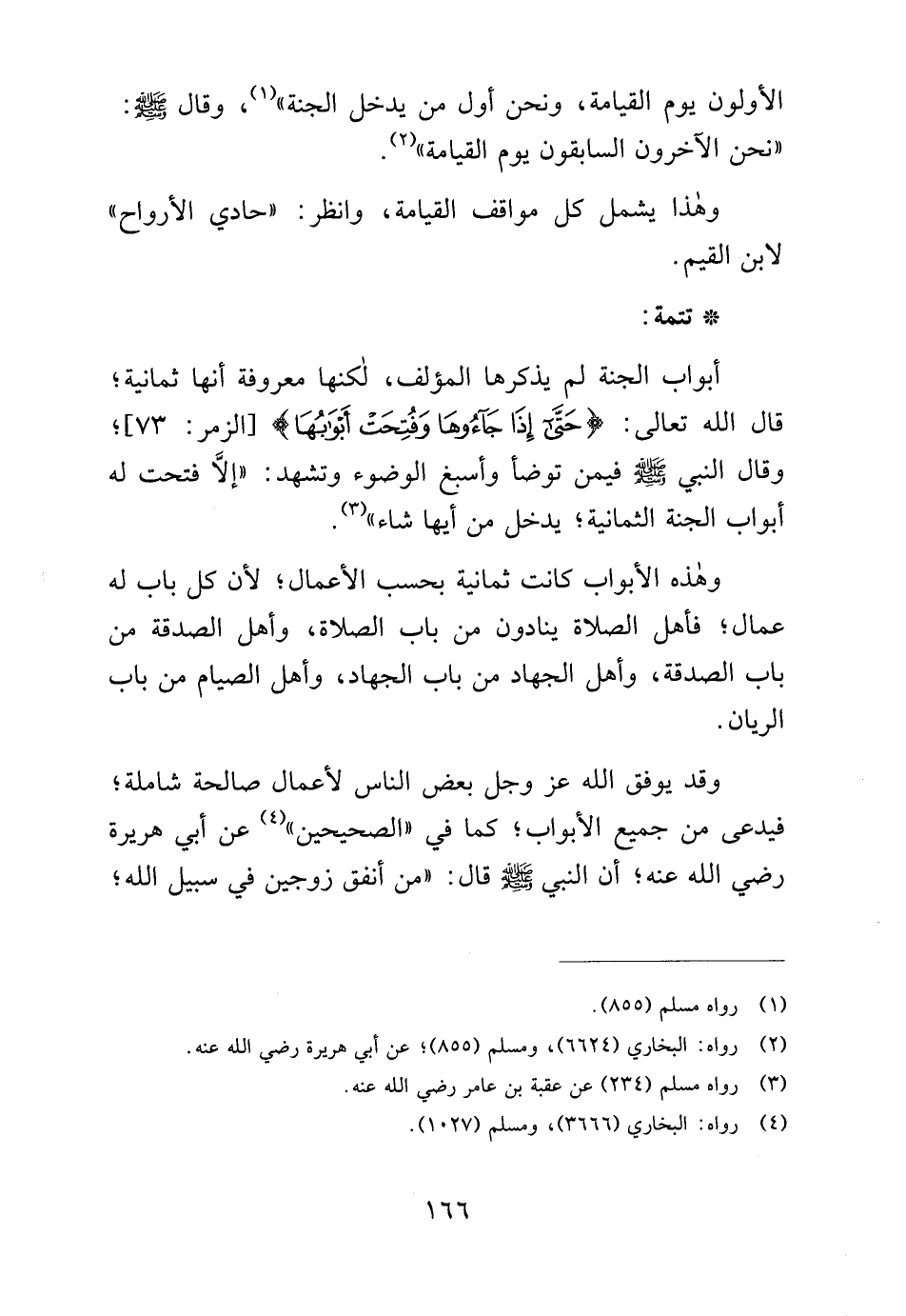 أبواب الجنة لم يذكرها المؤلف، لكنها معروفة أنها ثمانية؛ قال الله تعالى: {حَتَّى إِذَا جَاءُوهَا وَفُتِحَتْ أَبْوَابُهَا} [الزمر: 73]؛ وقال النبي - صلى الله عليه وسلم - فيمن توضأ وأسبغ الوضوء وتشهد: "إلَّا فتحت له أبواب الجنة الثمانية، يدخل من أيها شاء" (¬3).