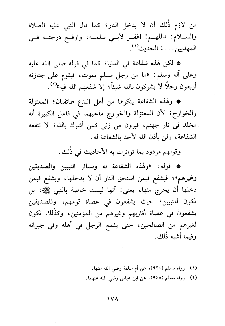 * قوله: "وهذه الشفاعة له ولسائر النبيين والصديقين وغيرهم"؛ فيشفع فيمن استحق النار أن لا يدخلها، ويشفع فيمن دخلها أن يخرج منها، يعني: أنها ليست خاصة بالنبي - صلى الله عليه وسلم -، بل تكون للنبيين؛ حيث يشفعون في عصاة قومهم، وللصديقين يشفعون في عصاة أقاربهم وغيرهم من المؤمنين، وكذلك تكون لغيرهم من الصالحين، حتى يشفع الرجل في أهله وفي جيرانه وفيما أشبه ذلك.