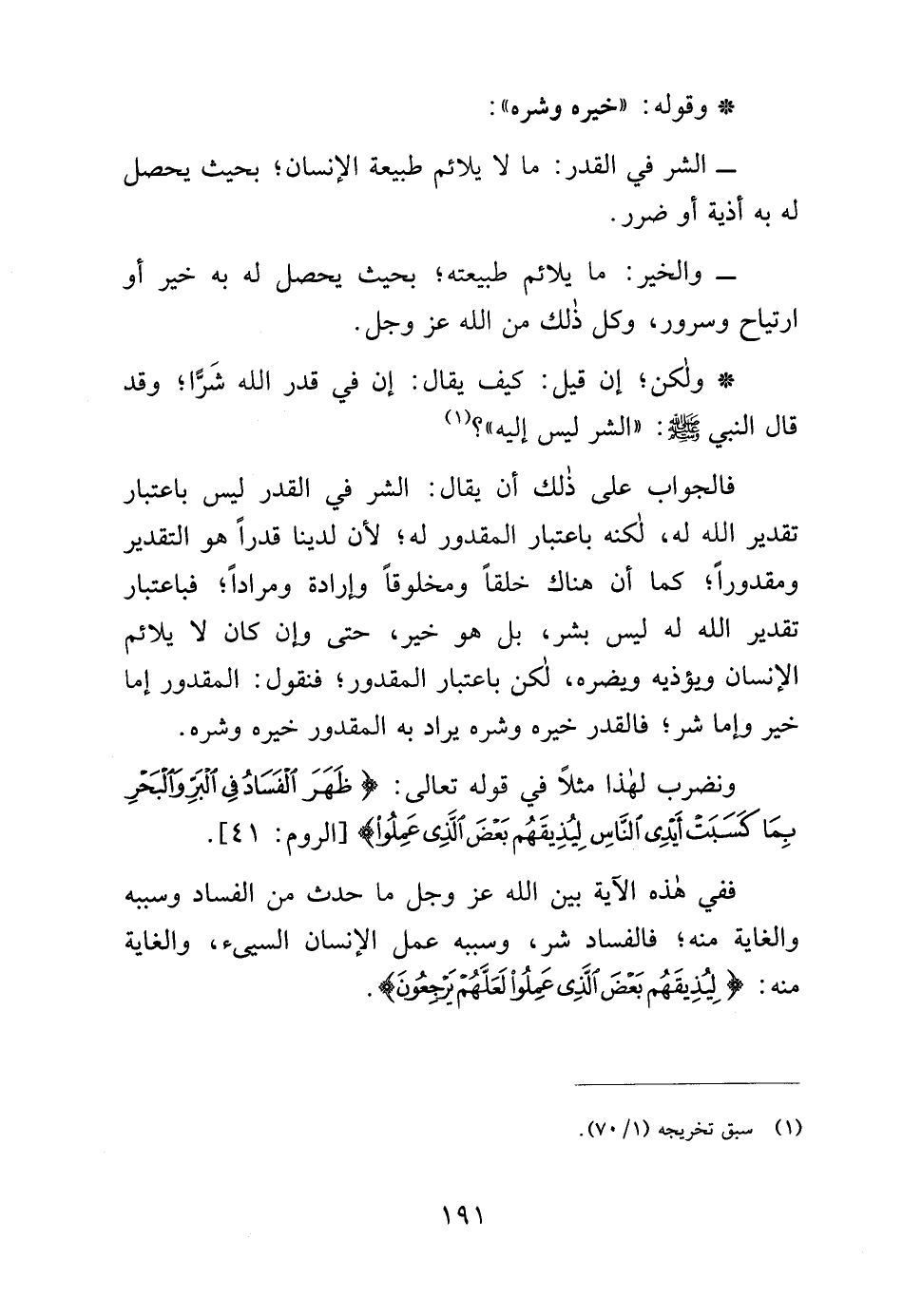 * ولكن؛ إن قيل: كيف يقال: إن في قدر الله شَرًّا؛ وقد قال النبي - صلى الله عليه وسلم -: "الشر ليس إليه"؟ (¬1)