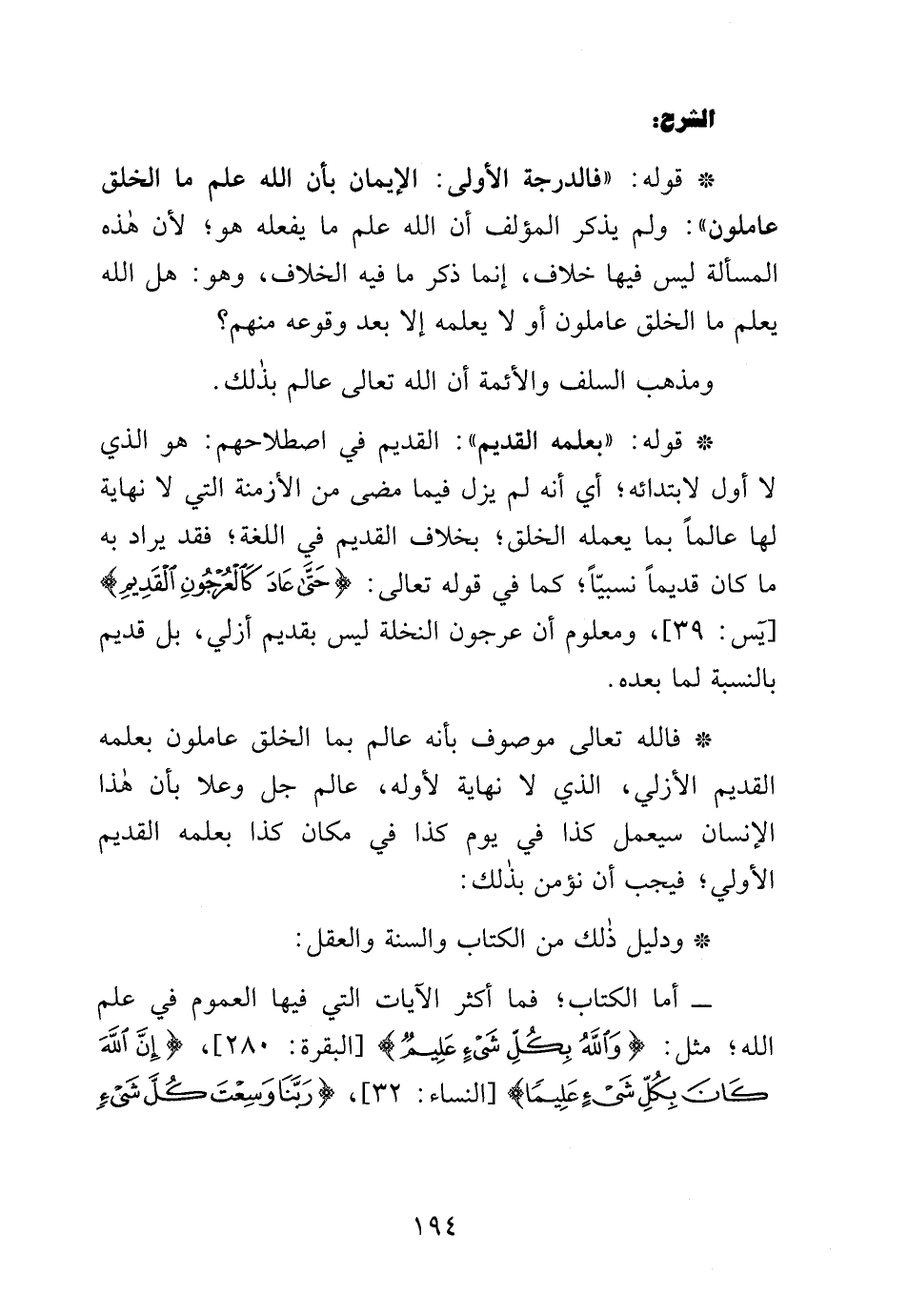 * قوله: "بعلمه القديم": القديم في اصطلاحهم: هو الذي لا أول لابتدائه؛ أي أنه لم يزل فيما مضى من الأزمنة التي لا نهاية لها عالمًا بما يعمله الخلق؛ بخلاف القديم في اللغة؛ فقد يراد به ما كان قديمًا نسبيًّا؛ كما في قوله تعالى: {حَتَّى عَادَ كَالْعُرْجُونِ الْقَدِيمِ} [يس: 39]، ومعلوم أن عرجون النخلة ليس بقديم أزلي، بل قديم بالنسبة لما بعده.