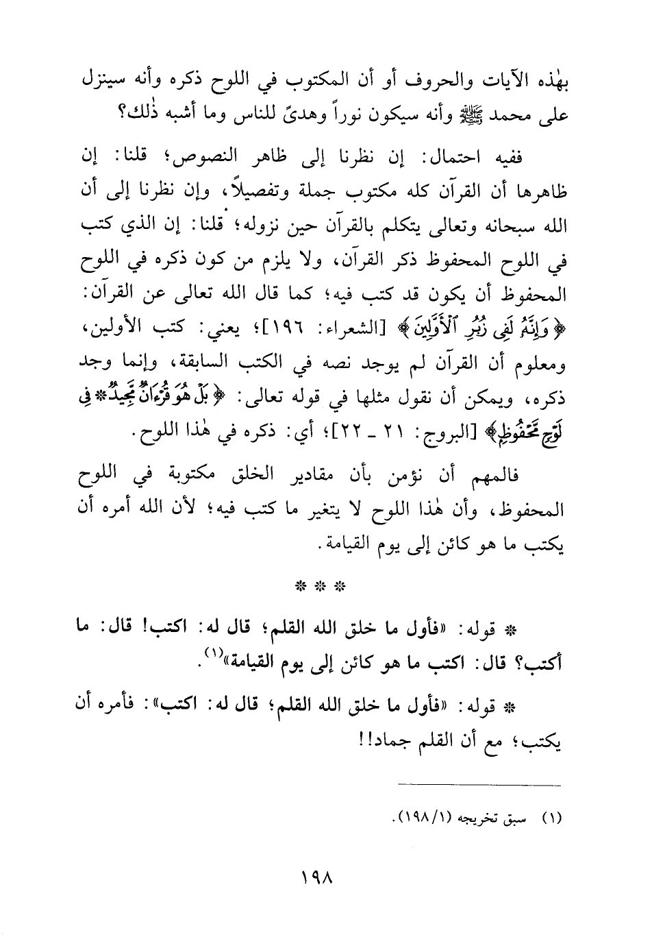 ففيه احتمال: إن نظرنا إلى ظاهر النصوص؛ قلنا: إن ظاهرها أن القرآن كله مكتوب جملة وتفصيلًا، وإن نظرنا إلى أن الله سبحانه وتعالى يتكلم بالقرآن حين نزوله، قلنا: إن الذي كتب في اللوح المحفوظ ذكر القرآن، ولا يلزم من كون ذكره في اللوح المحفوظ أن يكون قد كتب فيه؛ كما قال الله تعالى عن القرآن: {وَإِنَّهُ لَفِي زُبُرِ الْأَوَّلِينَ} [الشعراء: 196]؛ يعني: كتب الأولين، ومعلوم أن القرآن لم يوجد نصه في الكتب السابقة، وإنما وجد ذكره، ويمكن أن نقول مثلها في قوله تعالى: {بَلْ هُوَ قُرْآنٌ مَجِيدٌ * فِي لَوْحٍ مَحْفُوظٍ} [البروج: 21 - 22]؛ أي: ذكره في هذا اللوح.