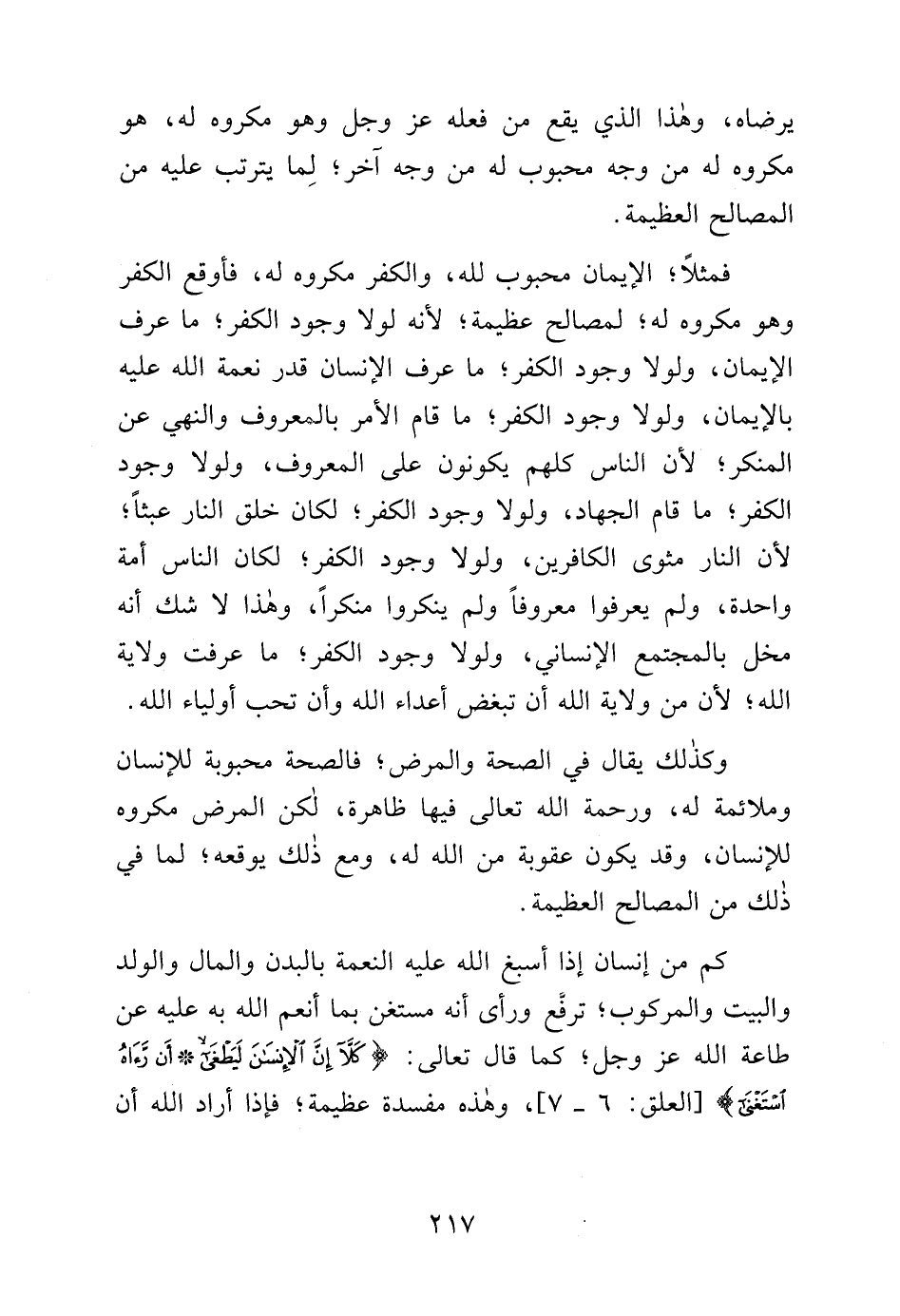 فمثلًا، الإيمان محبوب لله، والكفر مكروه له، فأوقع الكفر وهو مكروه له؛ لمصالح عظيمة؛ لأنه لولا وجود الكفر؛ ما عرف الإيمان، ولولا وجود الكفر؛ ما عرف الإنسان قدر نعمة الله عليه بالإيمان، ولولا وجود الكفر؛ ما قام الأمر بالمعروف والنهي عن المنكر؛ لأن الناس كلهم يكونون على المعروف، ولولا وجود الكفر؛ ما قام الجهاد، ولولا وجود الكفر؛ لكان خلق النار عبثًا؛ لأن النار مثوى الكافرين، ولولا وجود الكفر؛ لكان الناس أمة واحدة، ولم يعرفوا معروفًا ولم ينكروا منكرًا، وهذا لا شك أنه مخل بالمجتمع الإنساني، ولولا وجود الكفر؛ ما عرفت ولاية الله؛ لأن من ولاية الله أن تبغض أعداء الله وأن تحب أولياء الله.