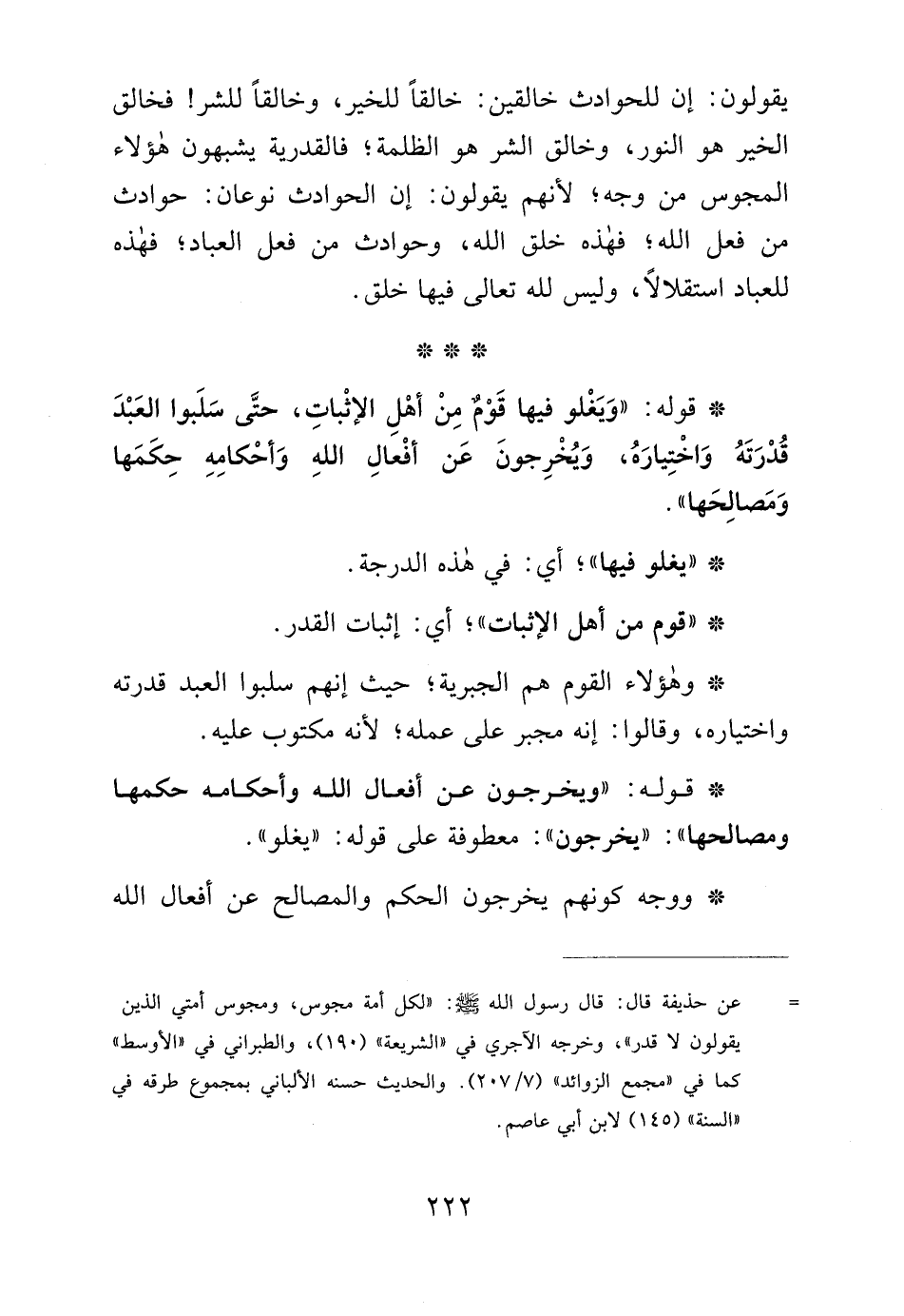 * قوله: "وَيَغْلو فيها قَوْمٌ مِنْ أهْلِ الإثْباتِ، حتَّى سَلَبوا العَبْدَ قُدْرَتَهُ وَاخْتِيارَهُ، وَيُخْرِجونَ عَن أفْعالِ اللهِ وَأحكامِهِ حِكَمَها وَمَصالِحَها".