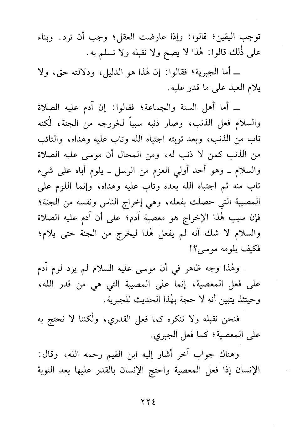 وهذا وجه ظاهر في أن موسى - عليه السلام - لم يرد لوم آدم على فعل المعصية، إنما على المصيبة التي هي من قدر الله، وحينئذ يتبين أنه لا حجة بهذا الحديث للجبرية.