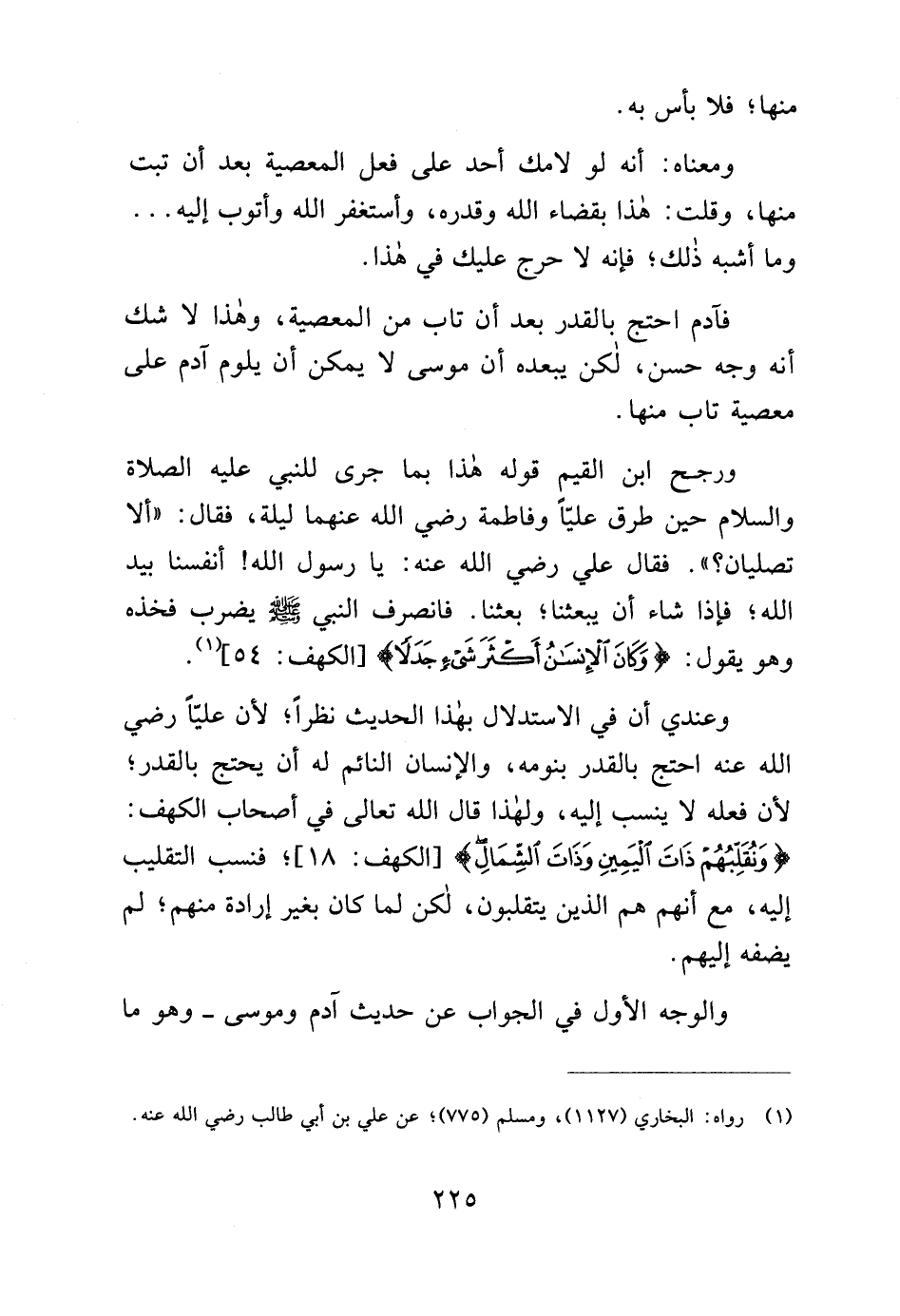 وعندي أن في الاستدلال بهذا الحديث نظرًا؛ لأن عليًّا رضي الله عنه احتج بالقدر بنومه، والإنسان النائم له أن يحتج بالقدر؛ لأن فعله لا ينسب إليه، ولهذا قال الله تعالى في أصحاب الكهف: {وَنُقَلِّبُهُمْ ذَاتَ الْيَمِينِ وَذَاتَ الشِّمَالِ} [الكهف: 18]؛ فنسب التقليب إليه، مع أنهم هم الذين يتقلبون، لكن لما كان بغير إرادة منهم؛ لم يضفه إليهم.