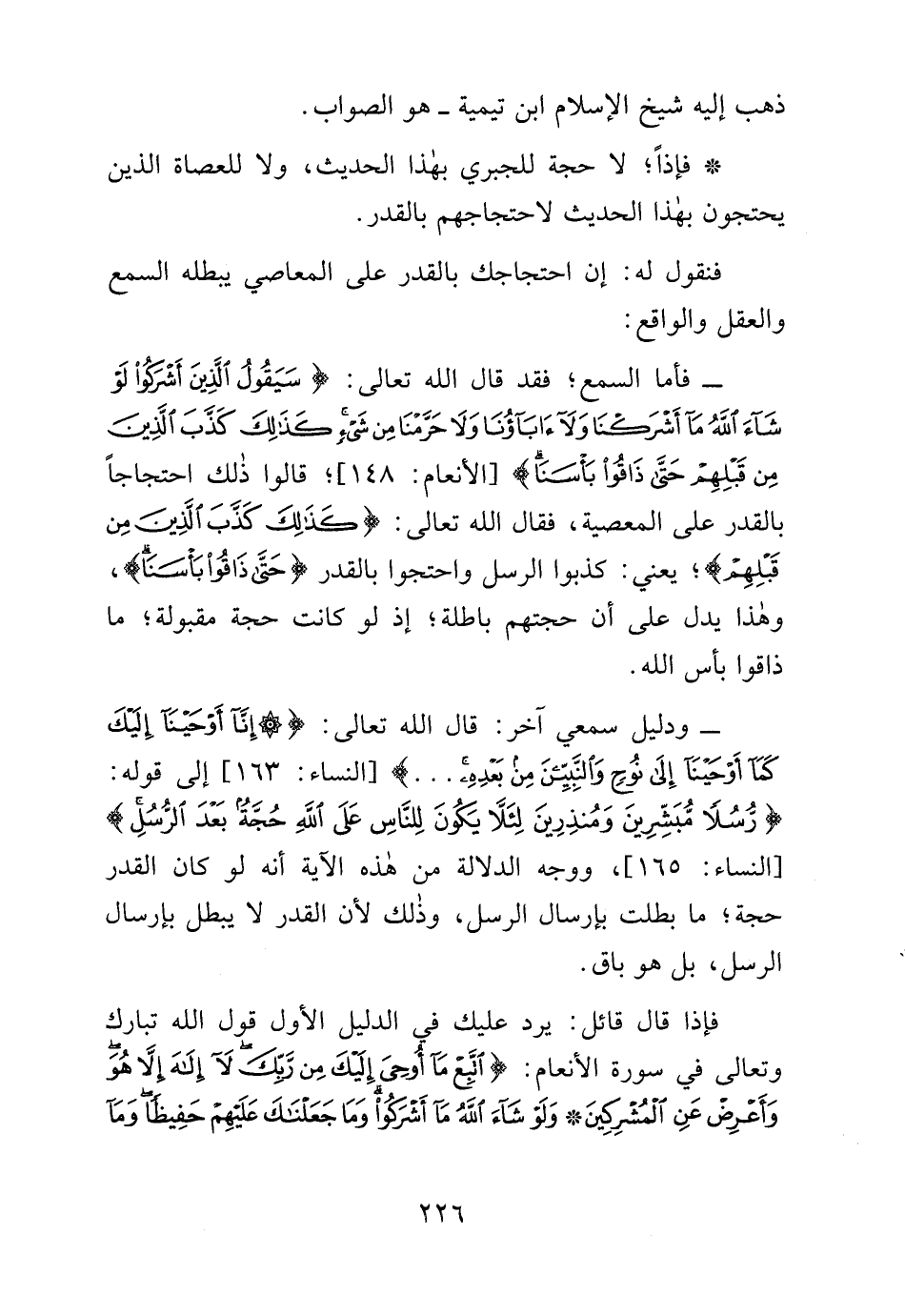 - ودليل سمعي آخر: قال الله تعالى: {إِنَّا أَوْحَيْنَا إِلَيْكَ كَمَا أَوْحَيْنَا إِلَى نُوحٍ وَالنَّبِيِّينَ مِنْ بَعْدِه} [النساء: 163] [النساء: 163] إلى قوله: {رُسُلًا مُبَشِّرِينَ وَمُنْذِرِينَ لِئَلَّا يَكُونَ لِلنَّاسِ عَلَى اللَّهِ حُجَّةٌ بَعْدَ الرُّسُلِ} [النساء: 165]، ووجه الدلالة من هذه الآية أنه لو كان القدر حجة؛ ما بطلت بإرسال الرسل، وذلك لأن القدر لا يبطل بإرسال الرسل، بل هو باق.