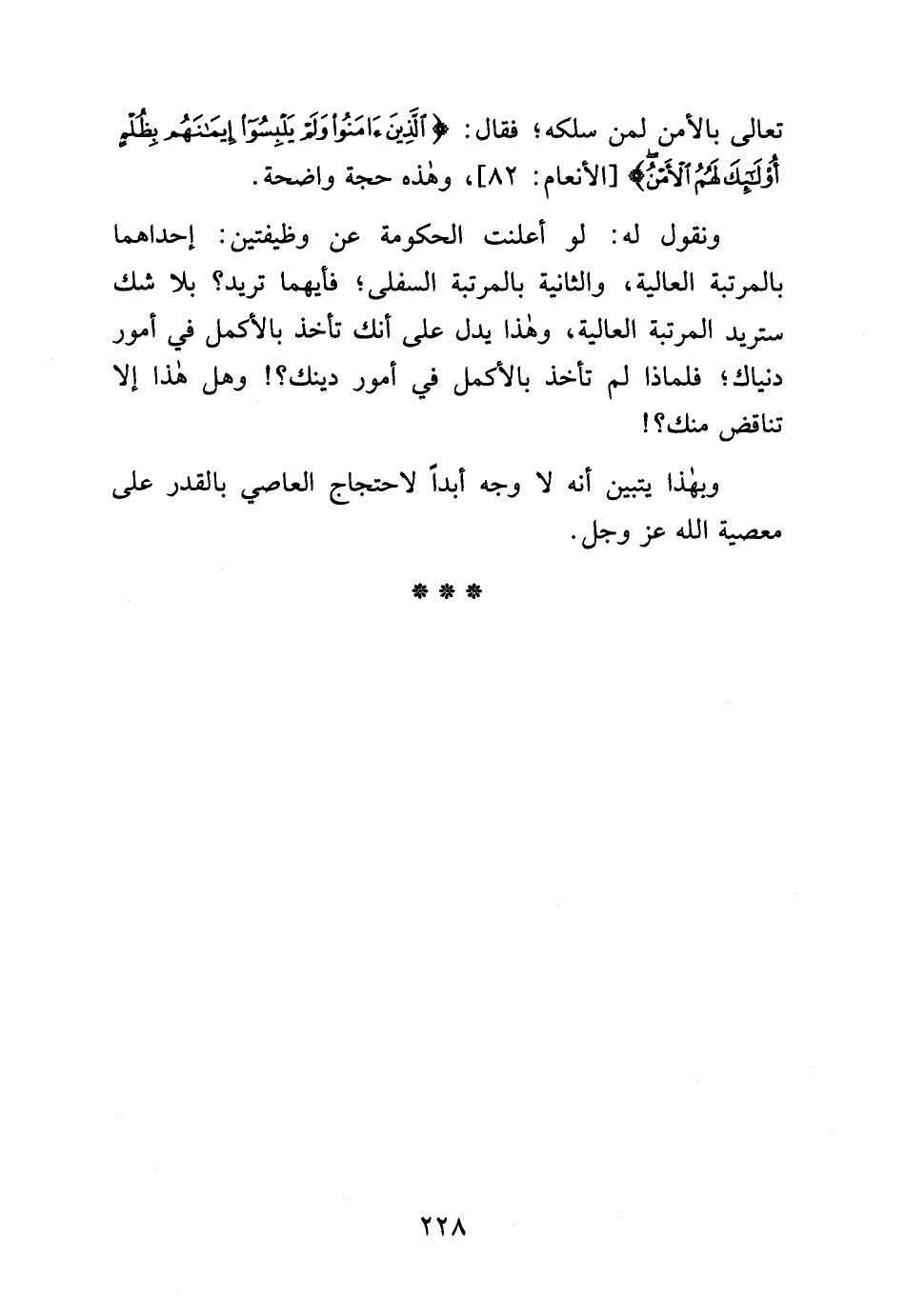 تعالى بالأمن لمن سلكه؛ فقال: {الَّذِينَ آمَنُوا وَلَمْ يَلْبِسُوا إِيمَانَهُمْ بِظُلْمٍ أُولَئِكَ لَهُمُ الْأَمْنُ} [الأنعام: 82]، وهذه حجة واضحة.