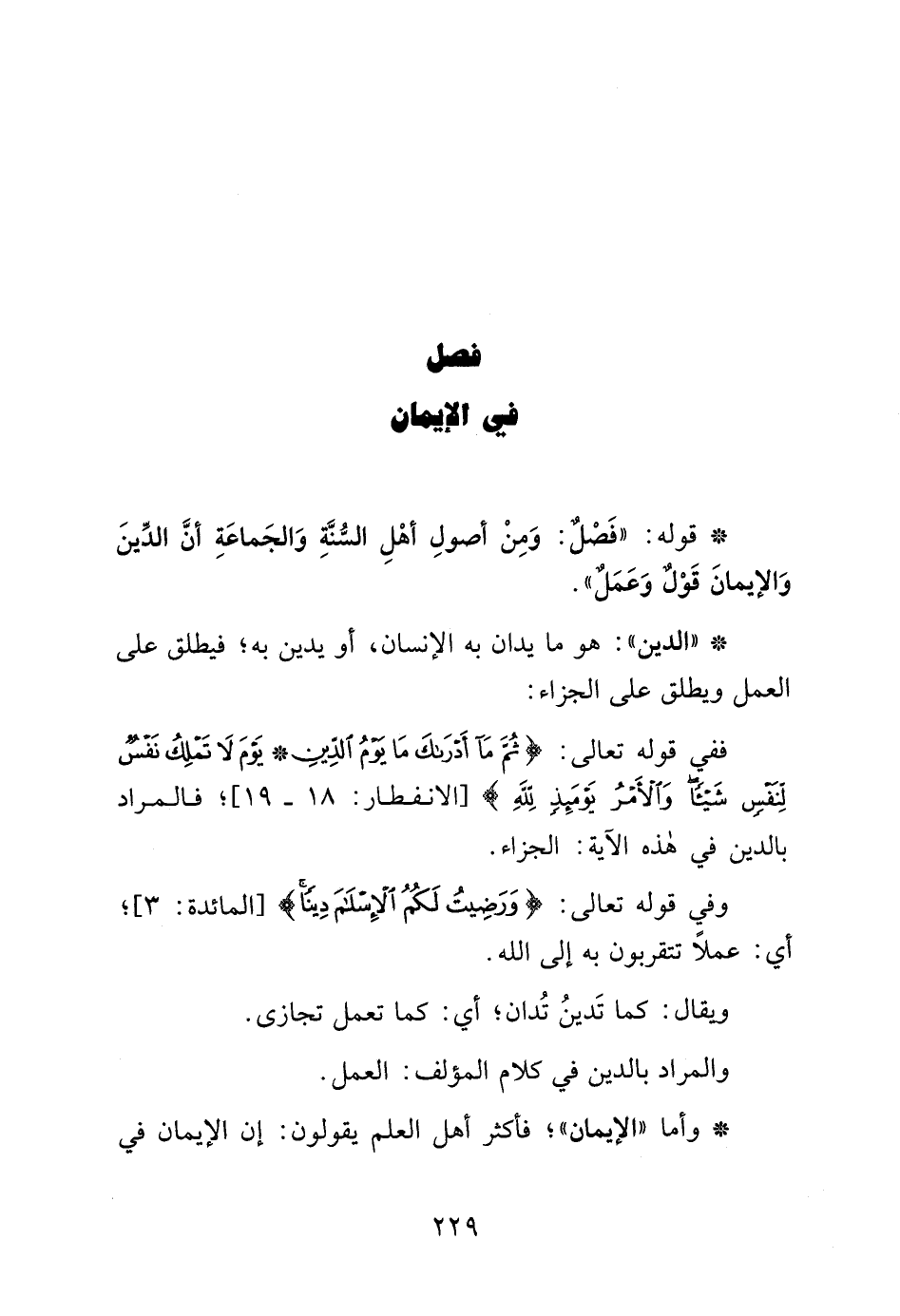 * قوله: "فَصْلٌ: وَمِنْ أصولِ أهْلِ السُّنَّةِ وَالجَماعَةِ أنَّ الدِّينَ وَالإيمانَ قَولٌ وَعَمَلٌ".