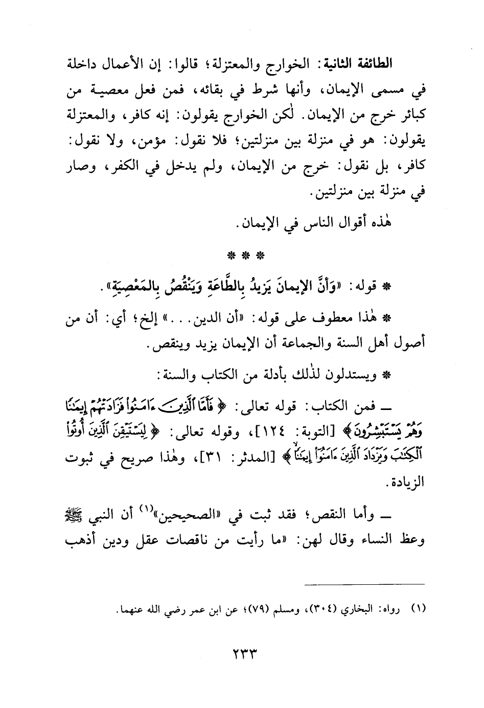 * قوله: "وَأنَّ الإيمانَ يَزيدُ بِالطَّاعَةِ وَيَنْقُصُ بِالمَعْصِيَةِ".