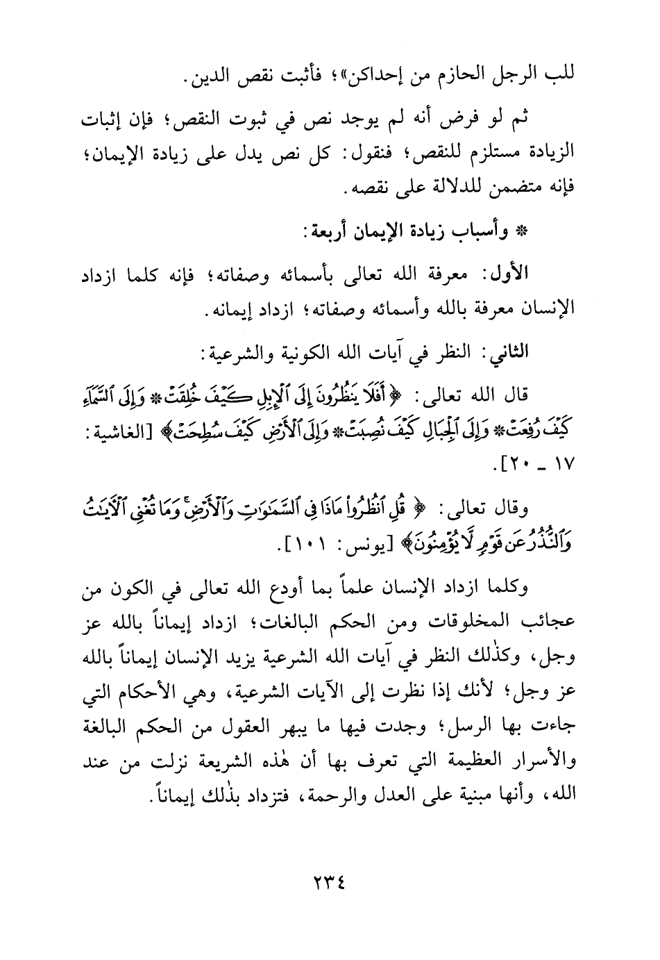 وكلما ازداد الإنسان علمًا بما أودع الله تعالى في الكون من عجائب المخلوقات ومن الحكم البالغات؛ ازداد إيمانًا بالله عز وجل، وكذلك النظر في آيات الله الشرعية يزيد الإنسان إيمانًا بالله عزَّ وجلَّ؛ لأنك إذا نظرت إلى الآيات الشرعية، وهي الأحكام التي جاءت بها الرسل؛ وجدت فيها ما يبهر العقول من الحكم البالغة والأسرار العظيمة التي تعرف بها أن هذه الشريعة نزلت من عند الله، وأنها مبنية على العدل والرحمة، فتزداد بذلك إيمانًا.