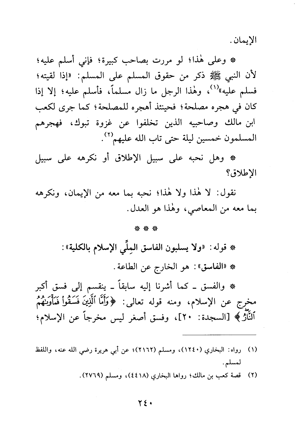 * وعلى هذا؛ لو مررت بصاحب كبيرة، فإني أسلم عليه؛ لأن النبي - صلى الله عليه وسلم - ذكر من حقوق المسلم على المسلم: "إذا لقيته، فسلم عليه" (¬1)، وهذا الرجل ما زال مسلمًا، فأسلم عليه، إلا إذا كان في هجره مصلحة؛ فحينئذ أهجره للمصلحة؛ كما جرى لكعب ابن مالك وصاحبيه الذين تخلفوا عن غزوة تبوك، فهجرهم المسلمون خمسين ليلة حتى تاب الله عليهم (¬2).