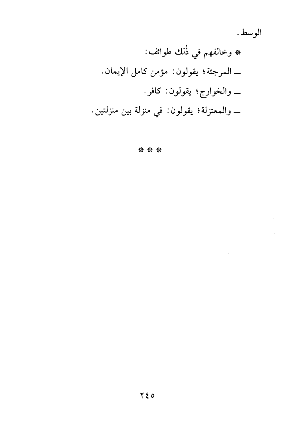 - والمعتزلة، يقولون: في منزلة بين منزلتين.