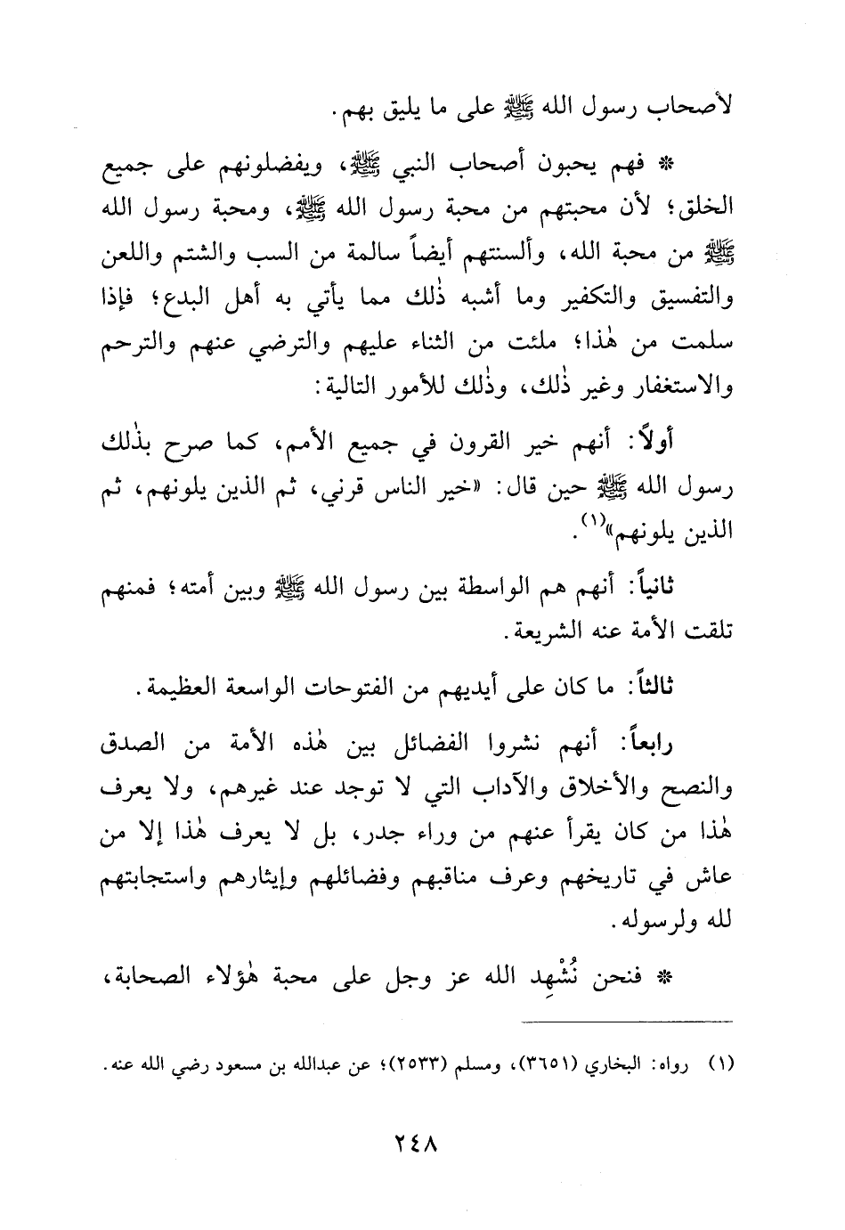 * فهم يحبون أصحاب النبي - صلى الله عليه وسلم -، ويفضلونهم على جميع الخلق؛ لأن محبتهم من محبة رسول الله - صلى الله عليه وسلم -، ومحبة رسول الله - صلى الله عليه وسلم - من محبة الله، وألسنتهم أيضًا سالمة من السب والشتم واللعن والتفسيق والتكفير وما أشبه ذلك مما يأتي به أهل البدع؛ فإذا سلمت من هذا، ملئت من الثناء عليهم والترضي عنهم والترحم والاستغفار وغير ذلك، وذلك للأمور التالية: